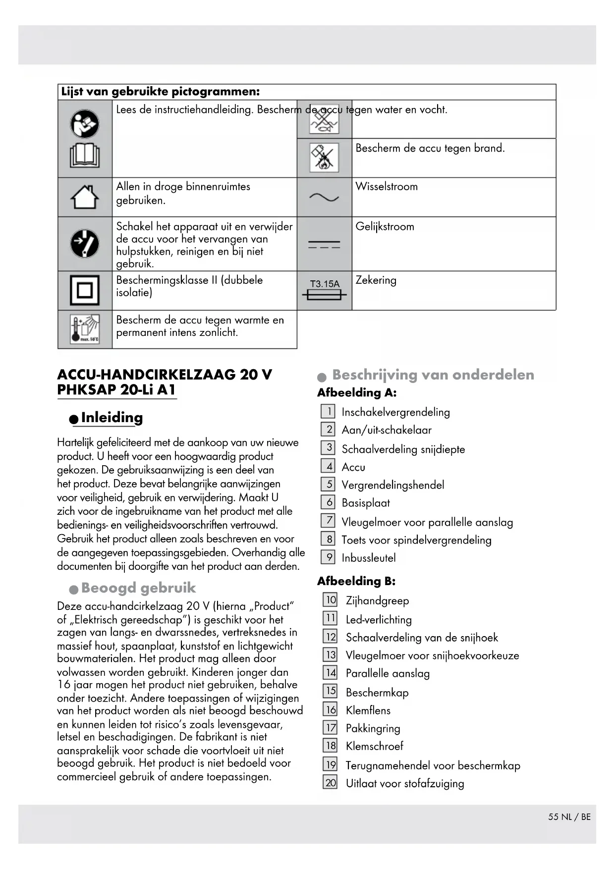 Uitlaat voor stofafzuiging ACCU-HANDCIRKELZAAG 20 V PHKSAP 20-Li A1 Q Inleiding Hartelijk gefeliciteerd met de aankoop van uw nieuwe product. U heeft voor een hoogwaardig product gekozen. De gebruiksaanwijzing is een deel van het product. Deze bevat belangrijke aanwijzingen voor veiligheid, gebruik en verwijdering. Maakt U zich voor de ingebruikname van het product met alle bedienings- en veiligheidsvoorschriften vertrouwd. Gebruik het product alleen zoals beschreven en voor de aangegeven toepassingsgebieden. Overhandig alle documenten bij doorgifte van het product aan derden. Q Beoogd gebruik Deze accu-handcirkelzaag 20 V (hierna „Product“ of „Elektrisch gereedschap”) is geschikt voor het zagen van langs- en dwarssnedes, vertreksnedes in massief hout, spaanplaat, kunststof en lichtgewicht bouwmaterialen. Het product mag alleen door volwassen worden gebruikt. Kinderen jonger dan 16 jaar mogen het product niet gebruiken, behalve onder toezicht. Andere toepassingen of wijzigingen van het product worden als niet beoogd beschouwd en kunnen leiden tot risico’s zoals levensgevaar, letsel en beschadigingen. De fabrikant is niet aansprakelijk voor schade die voortvloeit uit niet beoogd gebruik. Het product is niet bedoeld voor commercieel gebruik of andere toepassingen. Lijst van gebruikte pictogrammen: Lees de instructiehandleiding. Bescherm de accu tegen water en vocht. Bescherm de accu tegen brand. Allen in droge binnenruimtes gebruiken. Wisselstroom Schakel het apparaat uit en verwijder de accu voor het vervangen van hulpstukken, reinigen en bij niet gebruik. Gelijkstroom Beschermingsklasse II (dubbele isolatie) T3.15A Zekering Bescherm de accu tegen warmte en permanent intens zonlicht.56 NL / BE Afbeelding C: