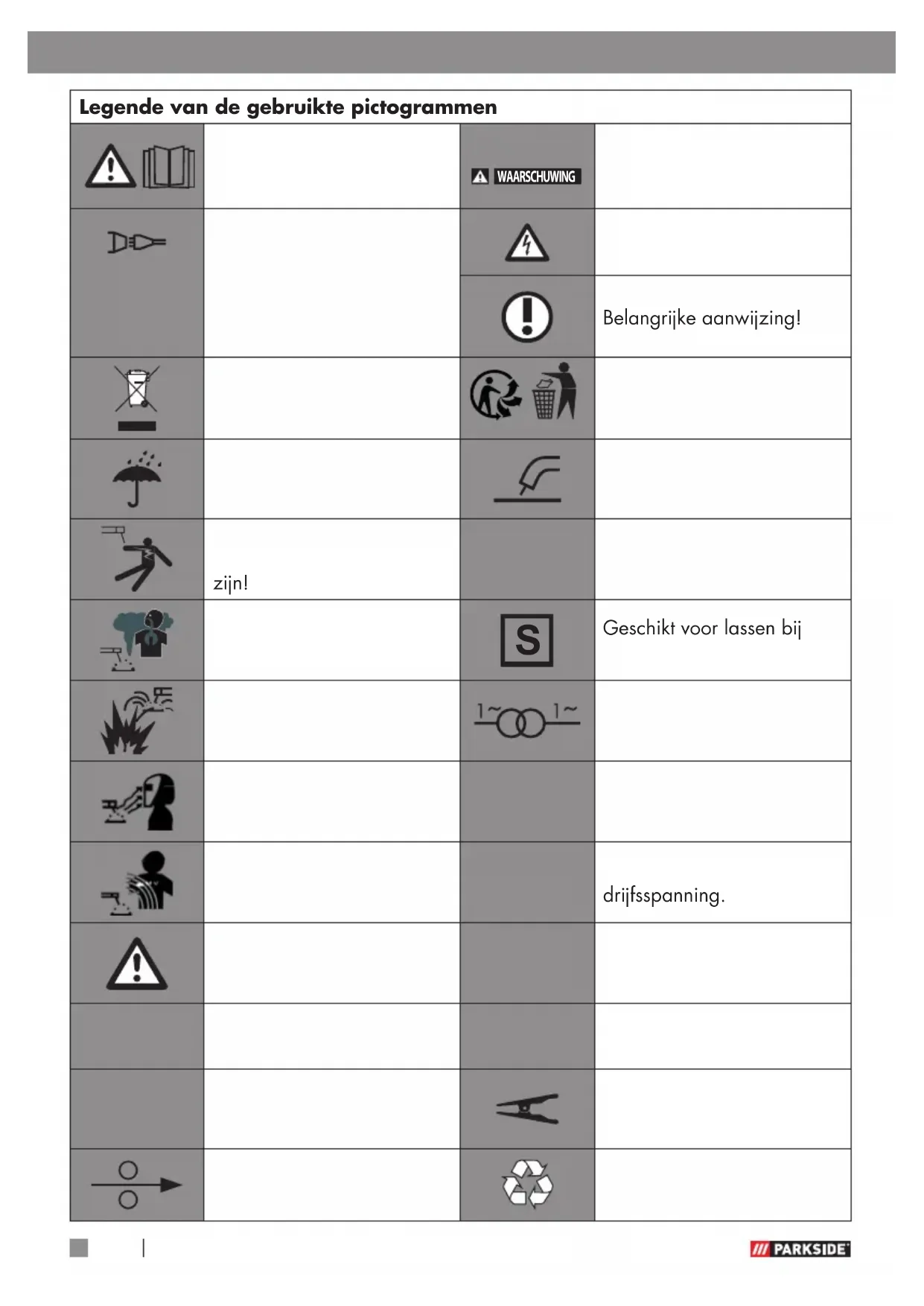 Geschikt voor lassen bij verhoogd elektrisch risico. Lasvonken kunnen een explosie of brand veroor- zaken. Eenfasige transformator. Lichtboogstralen kunnen de ogen beschadigen en de huid verwonden. HIslolatieklasse. Elektromagnetische velden kunnen de werking van pacemakers verstoren.