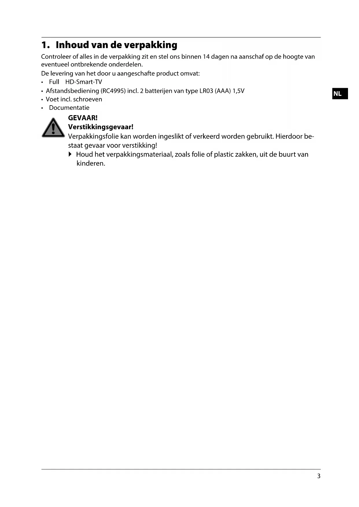 - In de verpakking bevinden zich verschillende kleine onderdelen (batterijen, etc.). Houd deze uit de buurt van kinderen. Er bestaat gevaar voor inslikken.