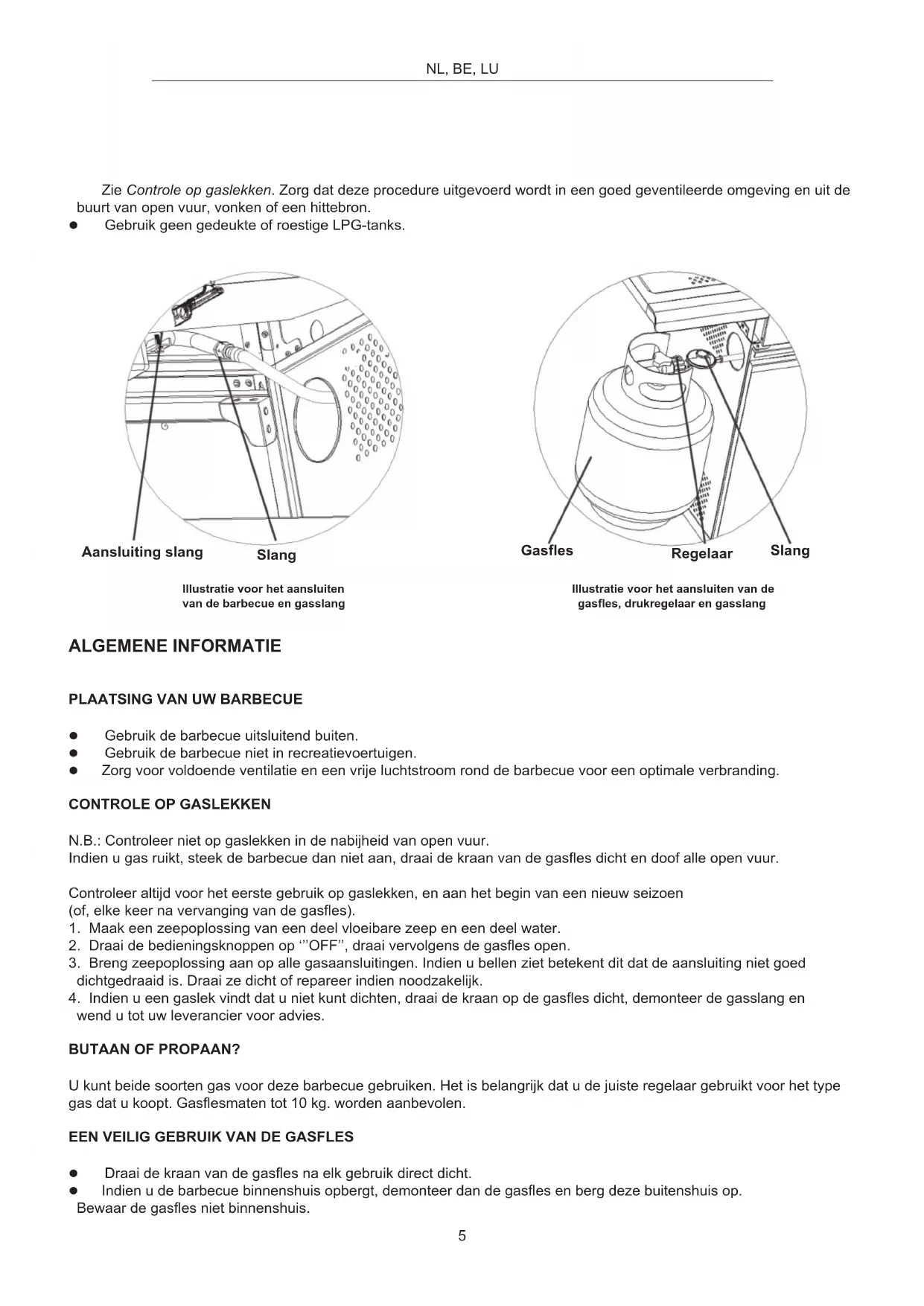 l Draai de kraan van de gases na elk gebruik direct dicht. l Indien u de barbecue binnenshuis opbergt, demonteer dan de gases en berg deze buitenshuis op. Bewaar de gases niet binnenshuis. Aansluiting slang Gases Regelaar Slang Slang Illustratie voor het aansluiten van de barbecue en gasslang Illustratie voor het aansluiten van de gases, drukregelaar en gasslangNL, BE, LU