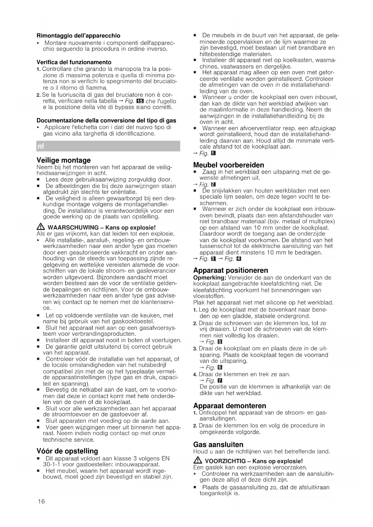 Omschakeling naar een ander gastype Wanneer de voorschriften van een land het toelaten, kan dit apparaat aan andere typen gas aanpassen worden aangepast, voor zover deze op het type- plaatje zijn vermeld. De passende onderdelen vindt u in de zak die met het apparaat is meegeleverd, of u kunt ze betrekken via de service. In de tabel →Fig.