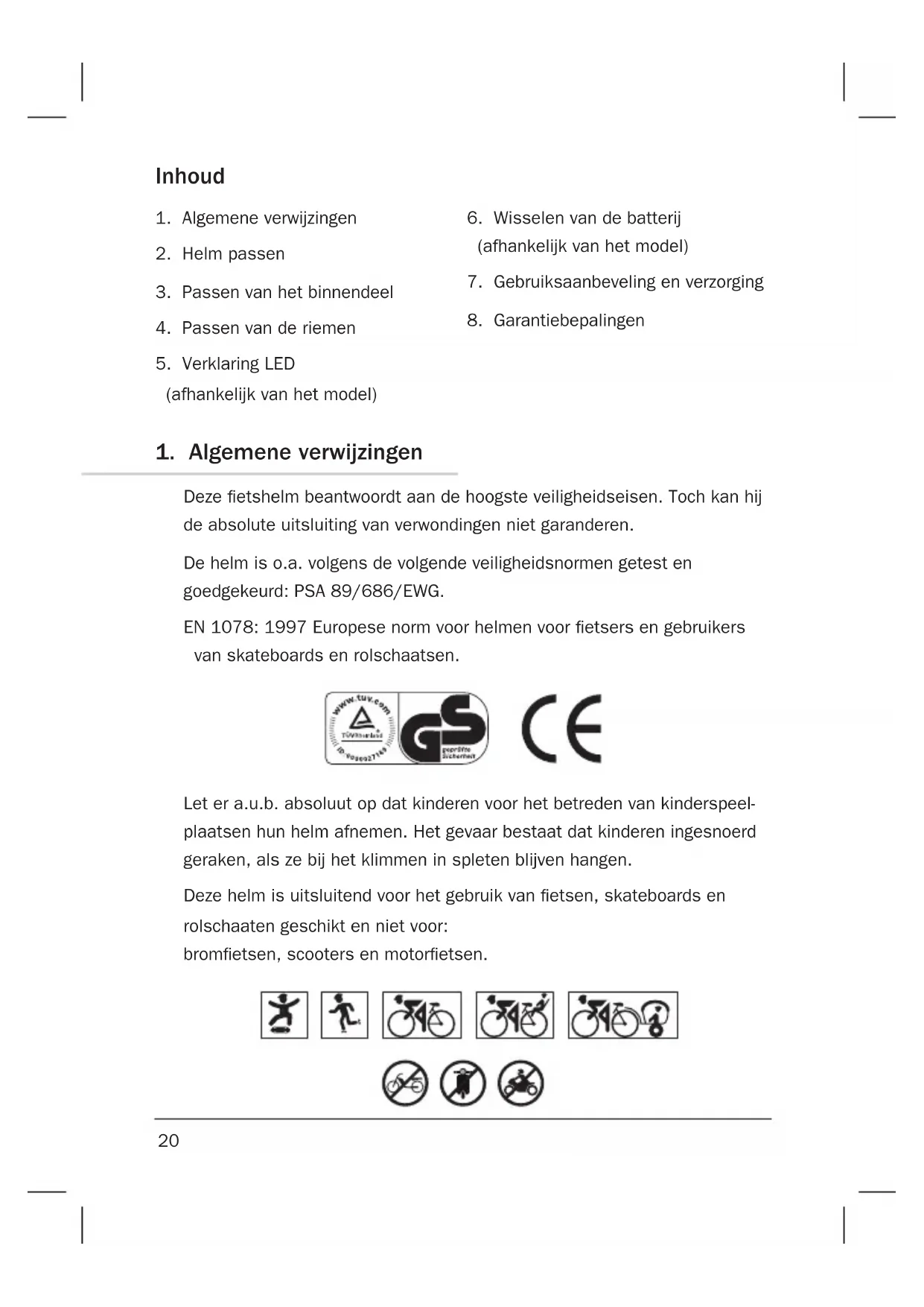 Deze etshelm beantwoordt aan de hoogste veiligheidseisen. Toch kan hij de absolute uitsluiting van verwondingen niet garanderen. De helm is o.a. volgens de volgende veiligheidsnormen getest en goedgekeurd: PSA 89/686/EWG. EN 1078: 1997 Europese norm voor helmen voor etsers en gebruikers van skateboards en rolschaatsen. Let er a.u.b. absoluut op dat kinderen voor het betreden van kinderspeel- plaatsen hun helm afnemen. Het gevaar bestaat dat kinderen ingesnoerd geraken, als ze bij het klimmen in spleten blijven hangen. Deze helm is uitsluitend voor het gebruik van etsen, skateboards en rolschaaten geschikt en niet voor: brometsen, scooters en motoretsen.