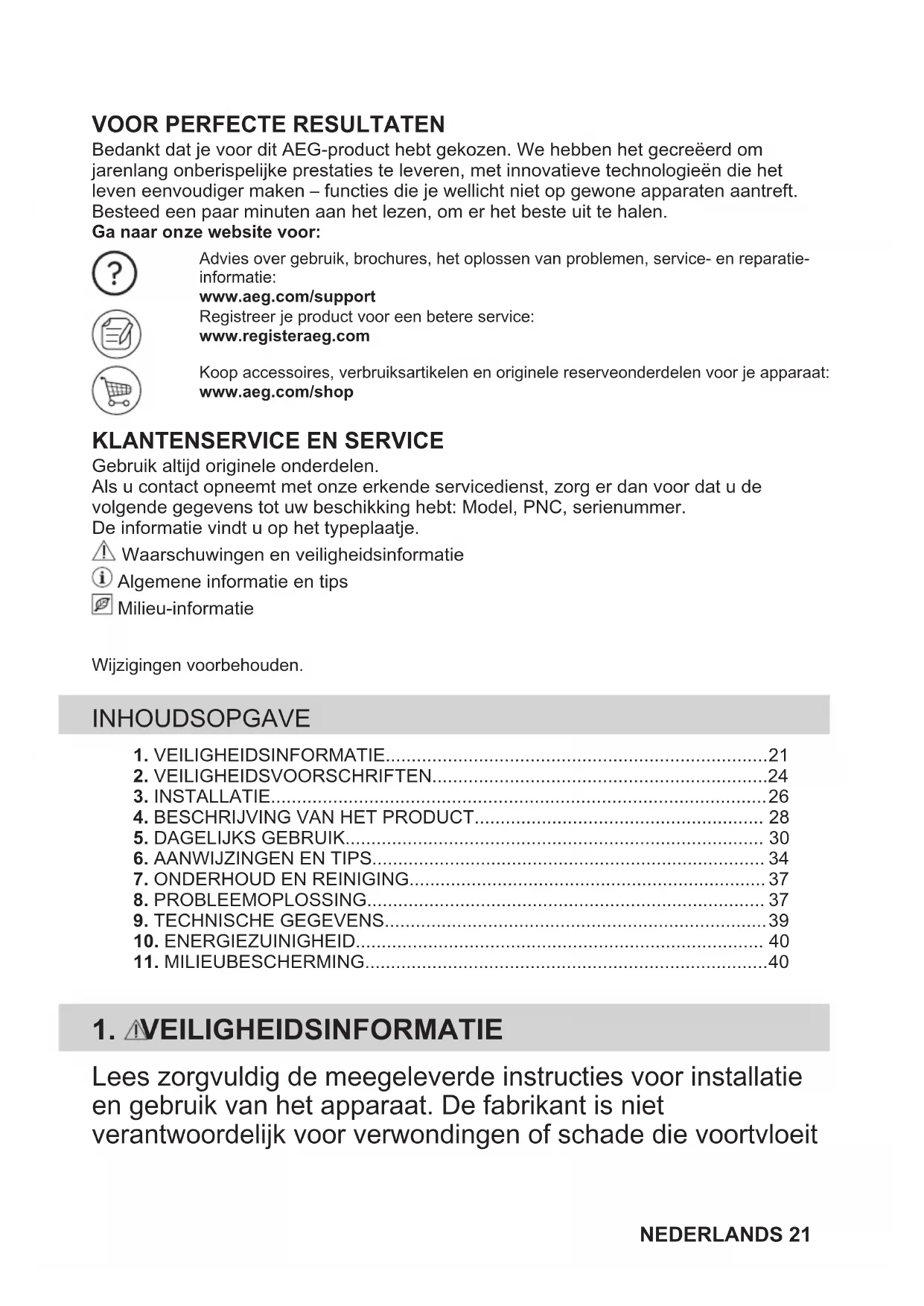 Bedankt dat je voor dit AEG-product hebt gekozen. We hebben het gecreëerd omjarenlang onberispelijke prestaties te leveren, met innovatieve technologieën die hetleven eenvoudiger maken – functies die je wellicht niet op gewone apparaten aantreft.Besteed een paar minuten aan het lezen, om er het beste uit te halen.Ga naar onze website voor:Advies over gebruik, brochures, het oplossen van problemen, service- en reparatie-informatie:www.aeg.com/supportRegistreer je product voor een betere service:www.registeraeg.comKoop accessoires, verbruiksartikelen en originele reserveonderdelen voor je apparaat:www.aeg.com/shop