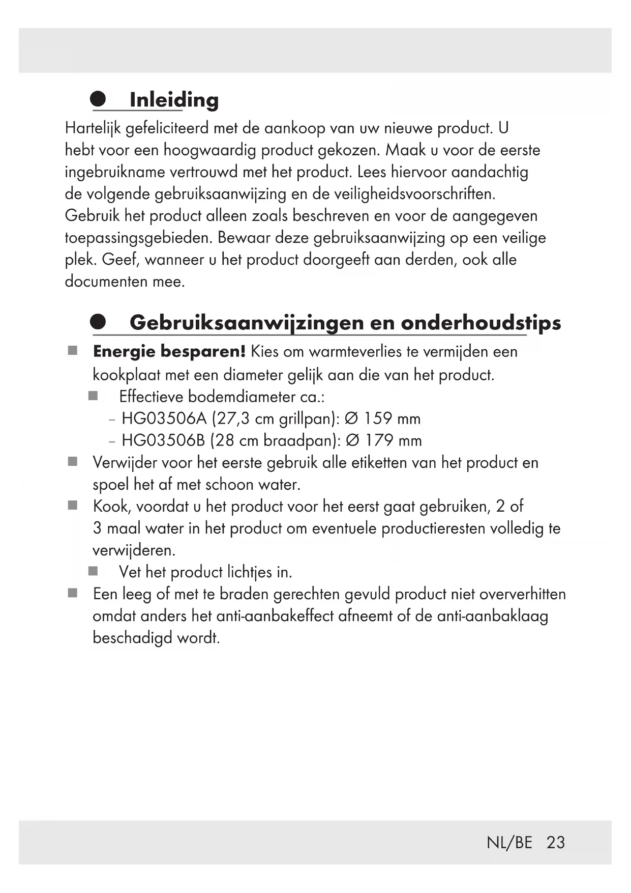 - s‘il présente les qualités qu‘un acheteur peut légitimement attendre eu égard aux déclarations publiques faites par le vendeur, par le producteur ou par son représentant, notamment dans la publicité ou l‘étiquetage ; 2° Ou s‘il présente les caractéristiques définies d‘un commun accord par les parties ou être propre à tout usage spécial recherché par l‘acheteur, porté à la connaissance du vendeur et que ce dernier a accepté. Article L217-12 du Code de la consommation L‘action résultant du défaut de conformité se prescrit par deux ans à compter de la délivrance du bien. Article 1641 du Code civil Le vendeur est tenu de la garantie à raison des défauts cachés de la chose vendue qui la rendent impropre à l‘usage auquel on la destine, ou qui diminuent tellement cet usage que l‘acheteur ne l‘aurait pas acquise, ou n‘en aurait donné qu‘un moindre prix, s‘il les avait connus. Article 1648 1er alinéa du Code civil L‘action résultant des vices rédhibitoires doit être intentée par l‘acquéreur dans un délai de deux ans à compter de la découverte du vice. Les pièces détachées indispensables à l’utilisation du produit sont disponibles pendant la durée de la garantie du produit.21FR/BE Le produit a été fabriqué selon des critères de qualité stricts et contrôlé consciencieusement avant sa livraison. En cas de défaillance, vous êtes en droit de retourner ce produit au vendeur. La présente garantie ne constitue pas une restriction de vos droits légaux. Ce produit bénéficie d‘une garantie de 3 ans à compter de sa date d’achat. La durée de garantie débute à la date d’achat. Veuillez conserver le ticket de caisse original. Il fera office de preuve d’achat. Si un problème matériel ou de fabrication devait survenir dans 3 ans suivant la date d‘achat de ce produit, nous assurons à notre discrétion la réparation ou le remplacement du produit sans frais supplémentaires. La garantie prend fin si le produit est endommagé suite à une utilisation inappropriée ou à un entretien défaillant. La garantie couvre les vices matériels et de fabrication. Cette garantie ne s’étend ni aux pièces du produit soumises à une usure normale (p. ex. des piles) et qui, par conséquent, peuvent être considérées comme des pièces d’usure, ni aux dommages sur des composants fragiles, comme des interrupteurs, des batteries ou des éléments fabriqués en verre.22 FR/BE Faire valoir sa garantie Pour garantir la rapidité d’exécution de la procédure de garantie, veuillez respecter les indications suivantes : Veuillez conserver le ticket de caisse et la référence du produit (IAN 385541_2107) à titre de preuve d’achat pour toute demande. Le numéro de référence de l’article est indiqué sur la plaque d’identification, gravé sur la page de titre de votre manuel (en bas à gauche) ou sur un autocollant apposé sur la face arrière ou inférieure du produit. En cas de dysfonctionnement du produit, ou de tout autre défaut, contactez en premier lieu le service après-vente par téléphone ou par e-mail aux coordonnées indiquées ci-dessous. Vous pouvez alors envoyer franco de port tout produit considéré comme défectueux au service clientèle indiqué, accompagné de la preuve d’achat (ticket de caisse) et d’une description écrite du défaut avec mention de sa date d’apparition. Service après-vente Service après-vente France Tél.: 0800904879 E-Mail: owim@lidl.fr Service après-vente Belgique Tél.: 080071011 Tél.: 80023970 (Luxembourg) E-Mail: owim@lidl.be23 NL/BE Inleiding Hartelijk gefeliciteerd met de aankoop van uw nieuwe product. U hebt voor een hoogwaardig product gekozen. Maak u voor de eerste ingebruikname vertrouwd met het product. Lees hiervoor aandachtig de volgende gebruiksaanwijzing en de veiligheidsvoorschriften. Gebruik het product alleen zoals beschreven en voor de aangegeven toepassingsgebieden. Bewaar deze gebruiksaanwijzing op een veilige plek. Geef, wanneer u het product doorgeeft aan derden, ook alle documenten mee. Gebruiksaanwijzingen en onderhoudstips Energie besparen! Kies om warmteverlies te vermijden een kookplaat met een diameter gelijk aan die van het product. Effectieve bodemdiameter ca.: – HG03506A (27,3 cm grillpan): Ø 159 mm – HG03506B (28 cm braadpan): Ø 179 mm Verwijder voor het eerste gebruik alle etiketten van het product en spoel het af met schoon water. Kook, voordat u het product voor het eerst gaat gebruiken, 2of 3maal water in het product om eventuele productieresten volledig te verwijderen. Vet het product lichtjes in. Een leeg of met te braden gerechten gevuld product niet oververhitten omdat anders het anti-aanbakeffect afneemt of de anti-aanbaklaag beschadigd wordt.24 NL/BE Oververhittingsgevaar! Bij niet ingevette, oververhitte pannen kan contact met vetvrije gerechten door verbranding van de eiwitten leiden tot verkleuring van de anti-aanbaklaag. Deze verkleuringen moeten gezien worden als gebruikssporen en zijn niet van invloed op de kwaliteit van de anti-aanbaklaag en de gebruiksgeschiktheid ervan. Verwarm de te bereiden gerechten op een hoge/gemiddelde verwarmingsstand en laat daarna alles op lage stand gaar worden. Houd het product altijd in het oog als er vet in verhit wordt: Oververhit vet kan ontbranden. Brandend vet nooit met water blussen! Verstik de vlammen met een deksel of een dikke wollen deken. Gebruik alleen keukengerei van hout of kunststof om de anti- aanbaklaag niet te beschadigen. Snijd de te koken gerechten niet direct in het product. Geen druppelnat vlees in het product doen. Het op een gloeiende kookplaat spattend vet kan gemakkelijk brand veroorzaken. Tijdens het koken kan de greep heet worden. Gebruik voor uw eigen bescherming een pannenlap of grillhandschoenen. Het product is geschikt voor gas en elektrisch koken zowel als voor glaskeramische-, inductie- en halogeenkookplaten.25NL/BE Tip voor inductiekookplaten: Onde