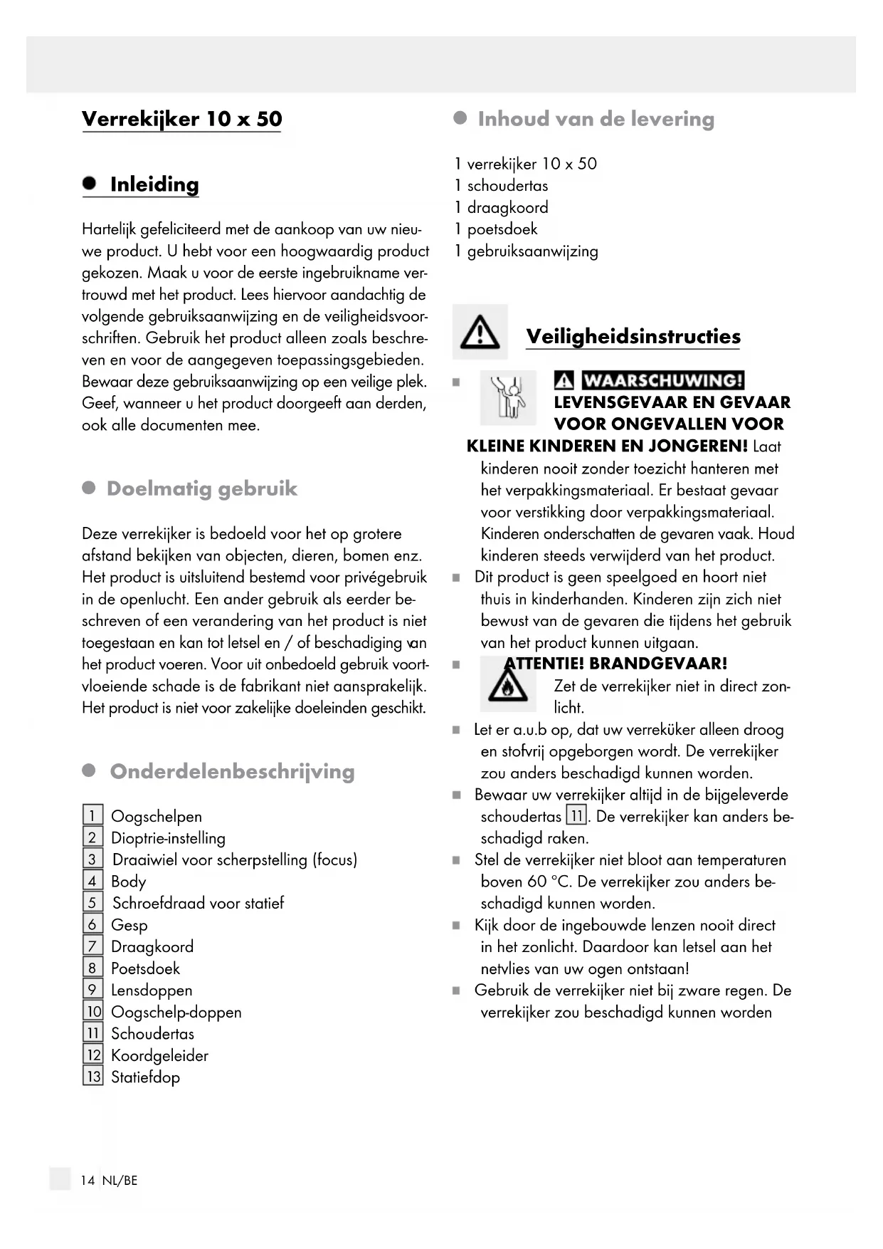 als deze niet wordt gebruikt.16 NL/BE Afvoer De verpakking bestaat uit milieuvriendelijke grond- stoffen die u via de plaatselijke recyclingcontainers kunt afvoeren. Informatie over de mogelijkheden om het uitgedien- de product na gebruik te verwijderen, verstrekt uw gemeentelijke overheid. Garantie Het product wordt volgens strenge kwaliteitsrichtlijnen zorgvuldig geproduceerd en voor levering grondig getest. In geval van schade aan het product kunt u rechtmatig beroep doen op de verkoper van het product. Deze wettelijke rechten worden door onze hierna vermelde garantie niet beperkt. Op dit product verlenen wij 5 jaar garantie vanaf aankoopdatum. De garantieperiode start op de dag van aankoop. Bewaar de originele kassabon alstublieft. Dit document is nodig als bewijs voor aankoop. Wanneer binnen 5 jaar na de aankoopdatum van dit product een materiaal- of productiefout optreedt, dan wordt het product door ons – naar onze keuze – gratis voor u gerepareerd of vervangen. Deze garantie komt te vervallen als het product bescha- digd wordt, niet correct gebruikt of onderhouden wordt. De garantie geldt voor materiaal- en productiefouten. Deze garantie is niet van toepassing op producton- derdelen, die onderhevig zijn aan normale slijtage en hierdoor als aan slijtage onderhevige onderdelen gelden (bijv. batterijen) of voor beschadigingen aan breekbare onderdelen, zoals bijv. schakelaars, acc u’s of dergelijke onderdelen, die gemaakt zijn van glas.17 DE/AT/CH Fernglas 10 x 50 Einleitung Wir beglückwünschen Sie zum Kauf Ihres neuen Produkts. Sie haben sich damit für ein hochwertiges Produkt entschieden. Machen Sie sich vor der ersten Inbetriebnahme mit dem Produkt vertraut. Lesen Sie hierzu aufmerksam die nachfolgende Bedienungs- anleitung und die Sicherheitshinweise. Benutzen Sie das Produkt nur wie beschrieben und für die angege- benen Einsatzbereiche. Bewahren Sie diese Anleitung an einem sicheren Ort auf. Händigen Sie alle Unter- lagen bei Weitergabe des Produktes an Dritte mit aus.
