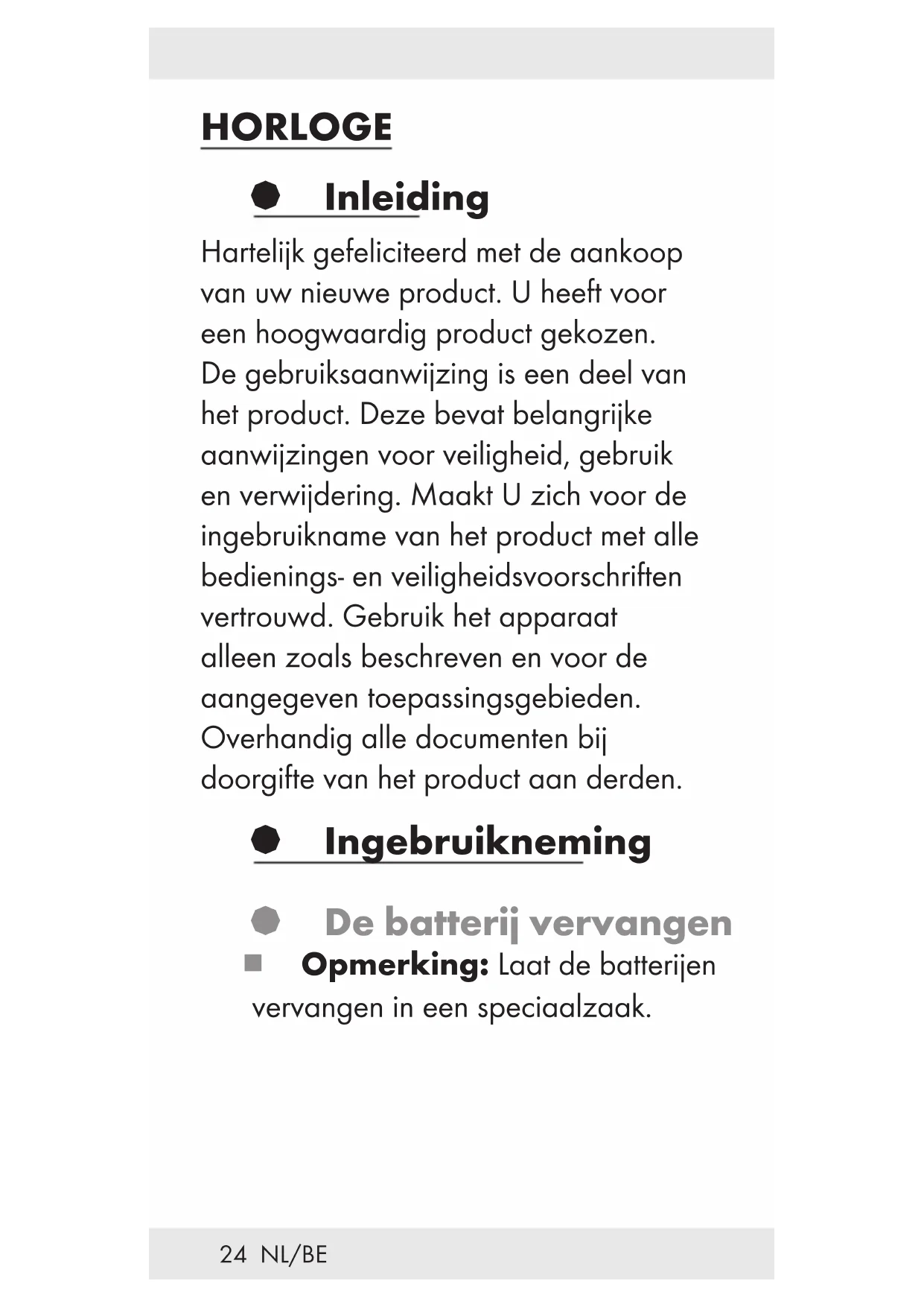 tegen de klok in om het begin van een tijdsbestek te markeren. § Reiniging en onderhoud Reinig het product alleen aan de buitenzijde met een zachte, droge doek.27 NL/BE § Verwijdering De verpakking bestaat uit milieuvriendelijke grondstoffen die U via de plaatselijke recyclecontainers kunt afvoeren. Informatie over de mogelijkheden om het uitgediende artikel na gebruik af te voeren, verstrekt uw gemeentelijke overheid. Voer het product omwille van het milieu niet af via het huisafval, maar geef het af bij het daarvoor bestemde depot of het gemeentelijke milieupark. Voor meer informatie over inzamelpunten en openingstijden kunt u contact opnemen met uw gemeente.28 NL/BE Defecte of verbruikte batterijen moeten volgens de richtlijn 2006 / 66 / G en diens veranderingen worden gerecycled. Geef batterijen en / of het apparaat af bij de daarvoor bestemde verzamelstations. Milieuschade door verkeerde afvoer van batterijen! Batterijen mogen niet via het huisafval worden afgevoerd. Ze kunnen giftig zwaar metaal bevatten en moeten worden behandeld als gevaarlijk afval. De chemische symbolen van de zware metalen zijn als volgt: Cd = cadmium, Hg = kwikzilver, Pb = lood. Geef verbruikte batterijen daarom af bij een gemeentelijk inzamelpunt.29 NL/BE § Garantie Het apparaat wordt volgens strenge kwaliteitsrichtlijnen zorgvuldig geproduceerd en voor levering grondig getest. In geval van schade aan het product kunt u rechtmatig beroep doen op de verkoper van het product. Deze wettelijke rechten worden door onze hierna vermelde garantie niet beperkt. U ontvangt op dit apparaat 3 jaar garantie vanaf de aankoopdatum. De garantieperiode start op de dag van aankoop. Bewaar de originele kassabon alstublieft. Dit document is nodig als bewijs voor aankoop. Wanneer binnen 3 jaar na de aankoopdatum van dit product een materiaal- of productiefout optreedt, dan wordt het product door ons – naar onze keuze – gratis voor u gerepareerd of vervangen. Deze garantie komt te vervallen als het product beschadigd wordt, niet correct gebruikt of onderhouden wordt.30 NL/BE De garantie geldt voor materiaal- en productiefouten. Deze garantie is niet van toepassing op productonderdelen, die onderhevig zijn aan normale slijtage en hierdoor als aan slijtage onderhevige onderdelen gelden (bijv. batterijen) of voor beschadigingen aan breekbare onderdelen, zoals bijv. schakelaars, accu’s of dergelijke onderdelen, die gemaakt zijn van glas. Het verminderen van de waterdichtheid valt eveneens niet onder de garantie. De toestand van de waterdichtheid is geen voortdurende eigenschap en dient daarom regelmatig onderhouden te worden. Houd er alstublieft rekening mee, dat door het openen en repareren van uw horloge door personen, die hiertoe niet gemachtigd zijn, uw garantie komt te vervallen.31 DE/AT/CH ARMBANDUHR § Einleitung Wir beglückwünschen Sie zum Kauf Ihres neuen Produkts. Sie haben sich damit für ein hochwertiges Produkt entschieden. Die Bedienungsanleitung ist Teil dieses Produkts. Sie enthält wichtige Hinweise für Sicherheit, Gebrauch und Entsorgung. Machen Sie sich vor der Benutzung des Produkts mit allen Bedien- und Sicherheitshinweisen vertraut. Benutzen Sie das Produkt nur wie beschrieben und für die angegebenen Einsatzbereiche. Händigen Sie alle Unterlagen bei Weitergabe des Produkts an Dritte mit aus. § Inbetriebnahme § Batterie wechseln Hinweis: Wenden Sie sich zum Wechseln der Batterie an ein Fachgeschäft.32 DE/AT/CH § Anzeige