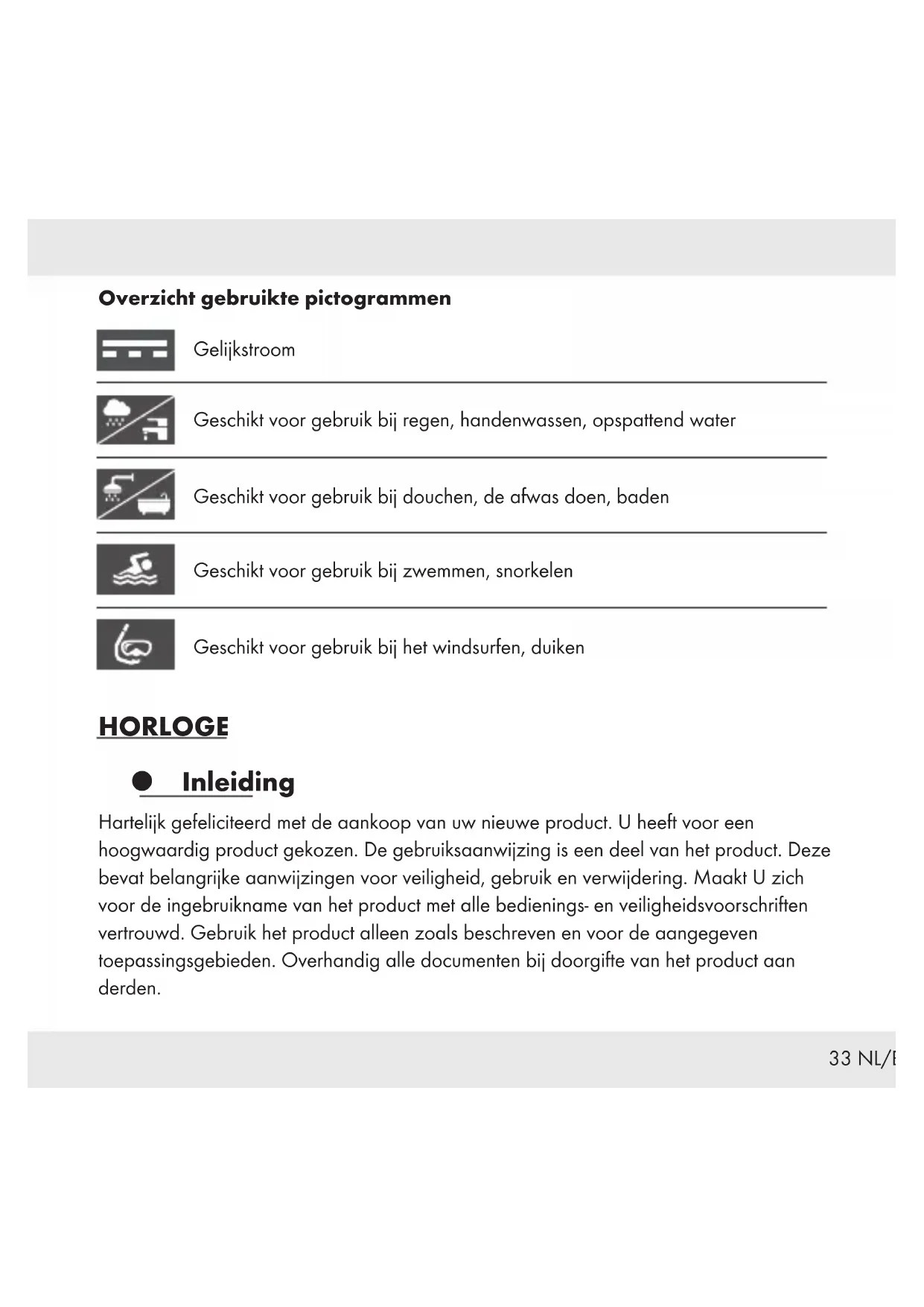 . Hiermee is de nieuwe pin geïnstalleerd. Schoonmaken en onderhoud Maak alleen de buitenkant van het product schoon met een schoon, zacht en vochtig doekje. Spoel het product, indien nodig, onder de kraan af. Droog het product na het afspoelen goed. Afvoer De verpakking is volledig gemaakt van recyclebare materialen die u bij uw lokaal inzamelpunt kunt inleveren. Neem de aanduiding van de verpakkingsmaterialen voor de afvalscheiding in acht. Deze zijn gemarkeerd met de afkortingen (a) en een cijfers (b) met de volgende betekenis: 1–7: kunststoffen/ 20–22: papier en vezelplaten/ 80–98: composietmaterialen.39 NL/BE Het product en de verpakkingsmaterialen zijn recyclebaar; verwijder deze afzonderlijk voor een betere afvalbehandeling. Het Triman-logo geldt alleen voor Frankrijk. Informatie over de mogelijkheden om het uitgediende product na gebruik te verwijderen, verstrekt uw gemeentelijke overheid. Gooi het afgedankte product omwille van het milieu niet weg via het huisvuil, maar geef het af bij het daarvoor bestemde depot of het gemeentelijke milieupark. Over afgifteplaatsen en hun openingstijden kunt u zich bij uw aangewezen instantie informeren. Defecte of gebruikte batterijen/ oplaadbare batterijen moeten volgens de richtlijn 2006/66/EG en diens wijzigingen worden gerecycled. Lever de batterijen/ oplaadbare batterijen en/ of het product in bij een erkend inzamelpunt. Milieuschade door verkeerde afvoer van batterijen/ oplaadbare batterijen! Batterijen/ oplaadbare batterijen mogen niet samen met het gewone huisvuil worden weggegooid. Ze kunnen giftig zwaar metaal bevatten en moeten worden behandeld als gevaarlijk afval. De chemische symbolen van de zware metalen zijn als volgt: Cd=cadmium, Hg=kwikzilver, Pb=lood. Lever uw gebruikte batterijen/ oplaadbare batterijen aldus in bij een gemeentelijk inzamelpunt.40 NL/BE Garantie Het product wordt volgens strenge kwaliteitsrichtlijnen zorgvuldig geproduceerd en voor levering grondig getest. In geval van schade aan het product kunt u rechtmatig beroep doen op de verkoper van het product. Deze wettelijke rechten worden door onze hierna vermelde garantie niet beperkt. Op dit product verlenen wij 3jaar garantie vanaf aankoopdatum. De garantieperiode start op de dag van aankoop. Bewaar de originele kassabon alstublieft. Dit document is nodig als bewijs voor aankoop. Wanneer binnen 3jaar na de aankoopdatum van dit product een materiaal- of productiefout optreedt, dan wordt het product door ons –naar onze keuze– gratis voor u gerepareerd of vervangen. Deze garantie komt te vervallen als het product beschadigd wordt, niet correct gebruikt of onderhouden wordt. De garantie geldt voor materiaal- en productiefouten. Deze garantie is niet van toepassing op productonderdelen, die onderhevig zijn aan normale slijtage en hierdoor als aan slijtage onderhevige onderdelen gelden (bijv. batterijen) of voor beschadigingen aan breekbare onderdelen, zoals bijv. schakelaars, accu’s of dergelijke onderdelen, die gemaakt zijn van glas. Het verminderen van de waterdichtheid valt eveneens niet onder de garantie. De toestand van de waterdichtheid is geen voortdurende eigenschap en dient daarom regelmatig onderhouden te worden. Houd er alstublieft rekening mee, dat door het openen en repareren van uw horloge door personen, die hiertoe niet gemachtigd zijn, uw garantie komt te vervallen.41 DE/AT/CH Liste der verwendeten Piktogramme ..........................Seite 42 Einleitung ....................................................Seite 42 Bestimmungsgemäße Verwendung ..............................Seite 43 Teilebeschreibung ............................................Seite 43 Technische Daten .............................................Seite 43 Lieferumfang.................................................Seite 44 Vor der Verwendung .........................................Seite 44 Batterie wechseln ............................................Seite 44 Zeit einstellen ................................................Seite 44 Zeit markieren (HG03879D) ..................................Seite 45 Wasserdichtigkeit ............................................Seite 45 Uhrenarmband anpassen (HG03879B) . . . . . . . . . . . . . . . . . . . . . . . . Seite 45 Uhrenarmband anpassen (HG03879D) .......................Seite 46 Segmente entnehmen ........................................Seite 46 Austausch des Stifts im Schieber (Abb. F, G, H).....................Seite 47 Reinigung und Pflege .........................................Seite 47 Entsorgung ...................................................Seite 47 Garantie .....................................................Seite 4942 DE/AT/CH Liste der verwendeten Piktogramme Gleichstrom Geeignet für Benutzung bei Regen, zum Hände waschen, bei Wasserspritzern Geeignet für Benutzung bei Duschen, Spülen, Baden Geeignet für Benutzung beim Schwimmen, Schnorcheln Geeignet für Benutzung beim Windsurfen, Tauchen ARMBANDUHR Einleitung Wir beglückwünschen Sie zum Kauf Ihres neuen Produkts. Sie haben sich damit für ein hochwertiges Produkt entschieden. Die Bedienungsanleitung ist Teil dieses Produkts. Sie enthält wichtige Hinweise für Sicherheit, Gebrauch und Entsorgung. Machen Sie sich vor der Benutzung des Produkts mit allen Bedien- und Sicherheitshinweisen vertraut. Benutzen Sie das Produkt nur wie beschrieben und für die angegebenen Einsatzbereiche. Händigen Sie alle Unterlagen bei Weitergabe des Produkts an Dritte mit aus.43 DE/AT/CH Bestimmungsgemäße Verwendung Dieses Produkt darf nur privat und nicht für gewerbliche Zwecke verwendet werden. Teilebeschreibung