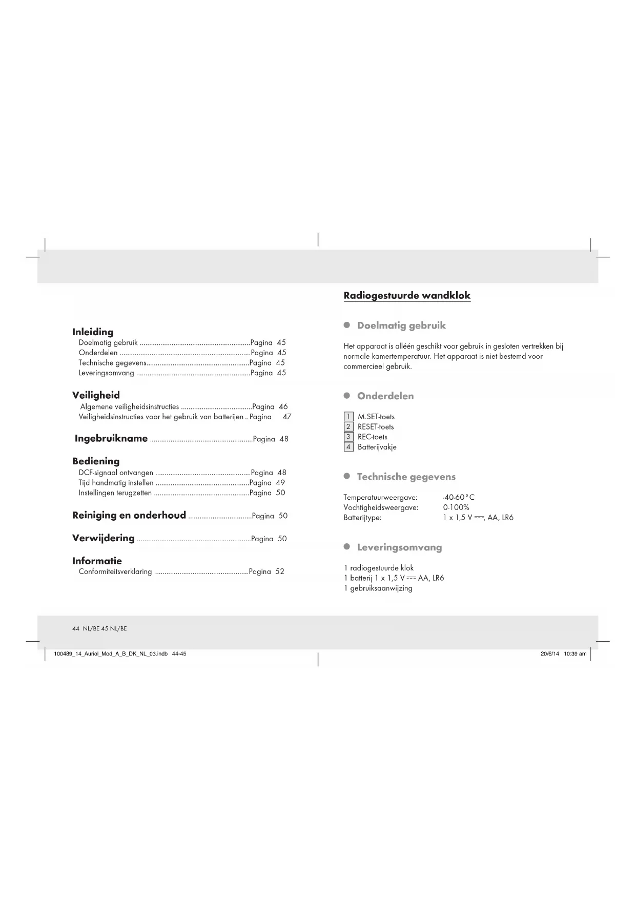 Leveringsomvang 1 radiogestuurde klok 1 batterij 1 x 1,5 V AA, LR6 1 gebruiksaanwijzing 100489_14_Auriol_Mod_A_B_DK_NL_03.indb 44-45 20/6/14 10:39 am46 NL/BE 47 NL/BE Veiligheid Lees alle veiligheidsinstructies en aanwijzingen. Nalatigheden bij de naleving van de veiligheidsinstructies en aanwijzingen kunnen elektrische schokken, brand en / of ernstig letsel tot gevolg hebben. Algemene veiligheidsinstructies LEVENSGEVAAR EN