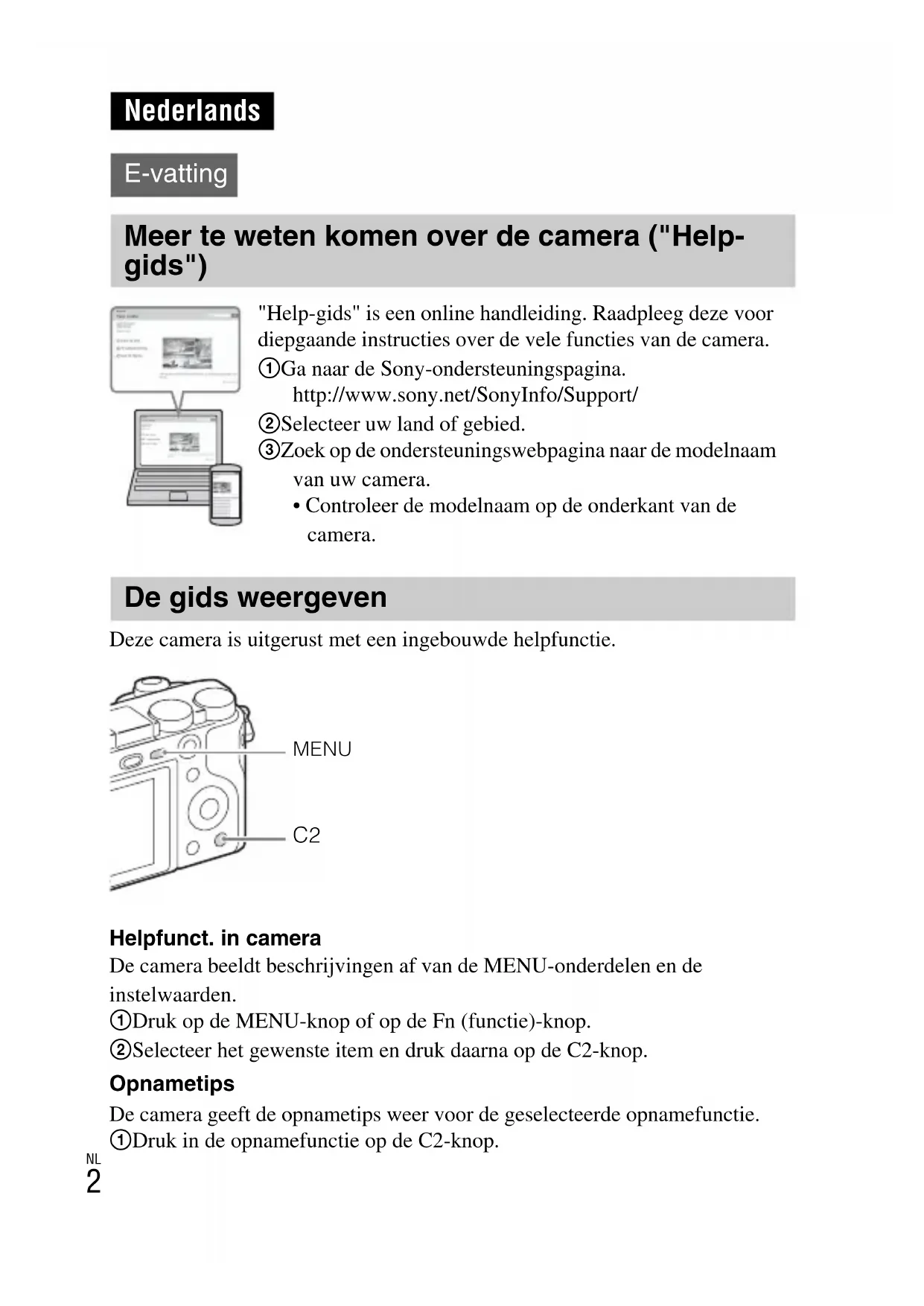 Deze camera is uitgerust met een ingebouwde helpfunctie. Helpfunct. in camera De camera beeldt beschrijvingen af van de MENU-onderdelen en de instelwaarden. 1 Druk op de MENU-knop of op de Fn (functie)-knop. 2 Selecteer het gewenste item en druk daarna op de C2-knop. Opnametips De camera geeft de opnametips weer voor de geselecteerde opnamefunctie. 1 Druk in de opnamefunctie op de C2-knop. Nederlands E-vatting Meer te weten komen over de camera ("Help- gids") "Help-gids" is een online handleiding. Raadpleeg deze voor diepgaande instructies over de vele functies van de camera. 1 Ga naar de Sony-ondersteuningspagina. http://www.sony.net/SonyInfo/Support/ 2 Selecteer uw land of gebied. 3 Zoek op de ondersteuningswebpagina naar de modelnaam van uw camera.