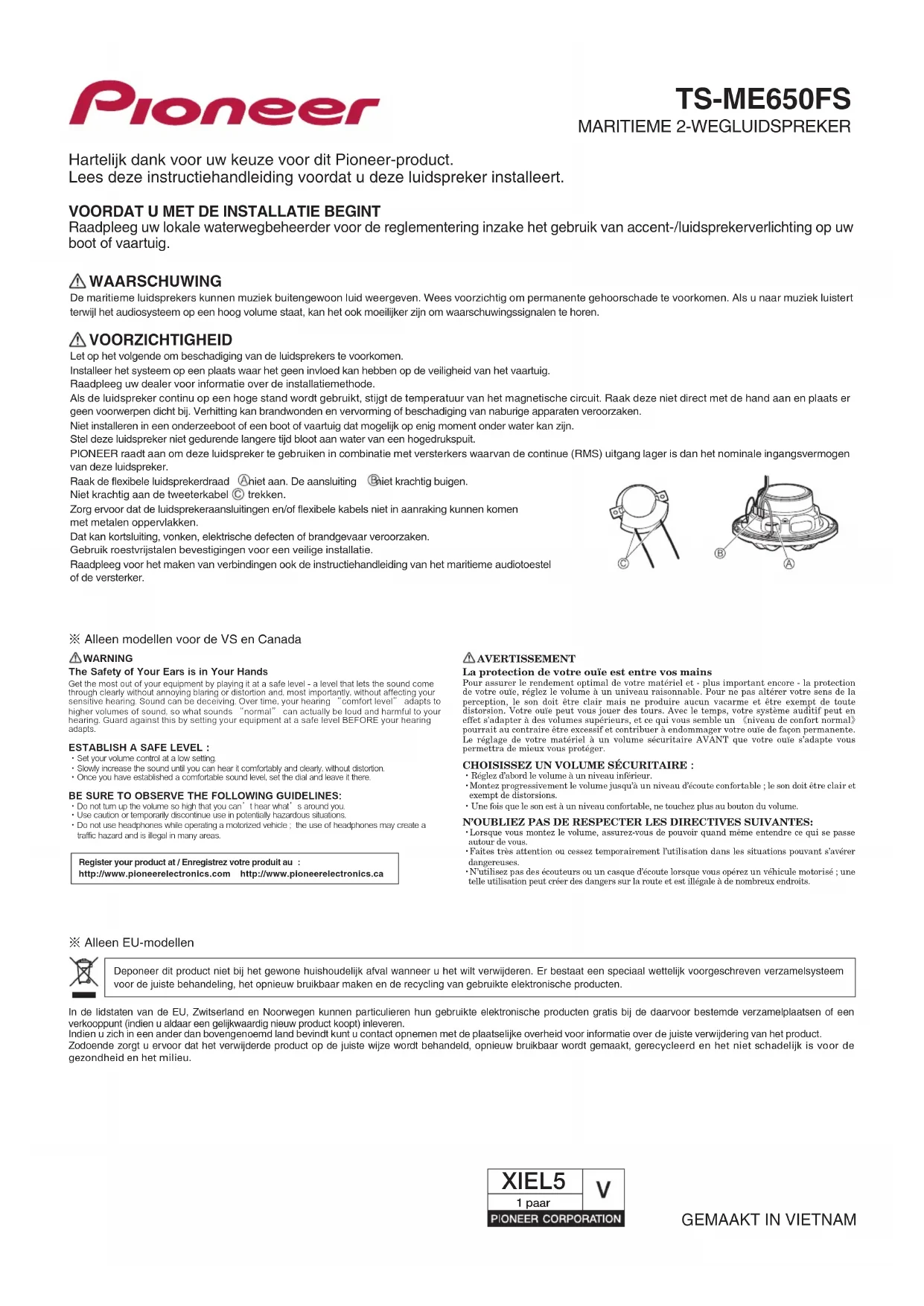 VOORZICHTIGHEIDLet op het volgende om beschadiging van de luidsprekers te voorkomen. Installeer het systeem op een plaats waar het geen invloed kan hebben op de veiligheid van het vaartuig.Raadpleeg uw dealer voor informatie over de installatiemethode. Als de luidspreker continu op een hoge stand wordt gebruikt, stijgt de temperatuur van het magnetische circuit. Raak deze niet direct met de hand aan en plaats er geen voorwerpen dicht bij. Verhitting kan brandwonden en vervorming of beschadiging van naburige apparaten veroorzaken.Niet installeren in een onderzeeboot of een boot of vaartuig dat mogelijk op enig moment onder water kan zijn.Stel deze luidspreker niet gedurende langere tijd bloot aan water van een hogedrukspuit. PIONEER raadt aan om deze luidspreker te gebruiken in combinatie met versterkers waarvan de continue (RMS) uitgang lager is dan het nominale ingangsvermogen van deze luidspreker.Raak de flexibele luidsprekerdraad niet aan. De aansluiting niet krachtig buigen.Niet krachtig aan de tweeterkabel trekken.Zorg ervoor dat de luidsprekeraansluitingen en/of flexibele kabels niet in aanraking kunnen komenmet metalen oppervlakken.Dat kan kortsluiting, vonken, elektrische defecten of brandgevaar veroorzaken.Gebruik roestvrijstalen bevestigingen voor een veilige installatie.Raadpleeg voor het maken van verbindingen ook de instructiehandleiding van het maritieme audiotoestel of de versterker. Hartelijk dank voor uw keuze voor dit Pioneer-product. Lees deze instructiehandleiding voordat u deze luidspreker installeert. MARITIEME 2-WEGLUIDSPREKER TS-ME650FS ※ Alleen modellen voor de VS en CanadaRegister your product at / Enregistrez votre produit au :http://www.pioneerelectronics.com http://www.pioneerelectronics.caGet the most out of your equipment by playing it at a safe level - a level that lets the sound come through clearly without annoying blaring or distortion and, most importantly, without affecting your sensitive hearing. Sound can be deceiving. Over time, your hearing “comfort level” adapts to higher volumes of sound, so what sounds “normal” can actually be loud and harmful to your hearing. Guard against this by setting your equipment at a safe level BEFORE your hearing adapts.The Safety of Your Ears is in Your Hands・Set your volume control at a low setting.・Slowly increase the sound until you can hear it comfortably and clearly, without distortion.・Once you have established a comfortable sound level, set the dial and leave it there.ESTABLISH A SAFE LEVEL ・Do not turn up the volume so high that you can’t hear what’s around you.・Use caution or temporarily discontinue use in potentially hazardous situations.・Do not use headphones while operating a motorized vehicle ; the use of headphones may create a traffic hazard and is illegal in many areas.BE SURE TO OBSERVE THE FOLLOWING GUIDELINES:WARNINGPour assurer le rendement optimal de votre matériel et - plus important encore - la protection de votre ouïe, réglez le volume à un univeau raisonnable. Pour ne pas altérer votre sens de la perception, le son doit être clair mais ne produire aucun vacarme et être exempt de toute distorsion. Votre ouïe peut vous jouer des tours. Avec le temps, votre système auditif peut en effet s’adapter à des volumes supérieurs, et ce qui vous semble un 《niveau de confort normal》 pourrait au contraire être excessif et contribuer à endommager votre ouïe de façon permanente. Le réglage de votre matériel à un volume sécuritaire AVANT que votre ouïe s’adapte vous permettra de mieux vous protéger.La protection de votre ouïe est entre vos mains・Réglez d’abord le volume à un niveau inférieur. ・Montez progressivement le volume jusqu’à un niveau d’écoute confortable ; le son doit être clair et exempt de distorsions.・Une fois que le son est à un niveau confortable, ne touchez plus au bouton du volume.CHOISISSEZ UN VOLUME SÉCURITAIRE