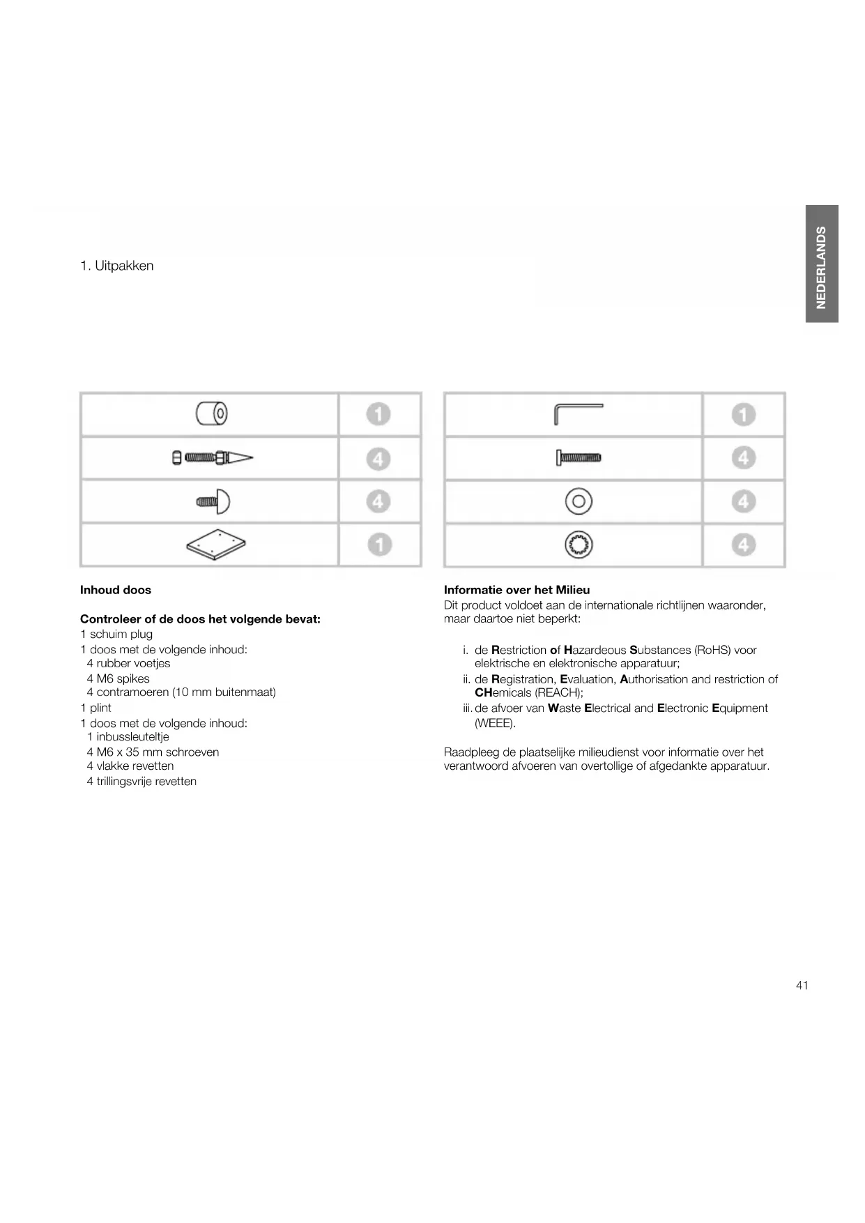 Inhoud doos Controleer of de doos het volgende bevat: 1 schuim plug 1 doos met de volgende inhoud: 4 rubber voetjes 4 M6 spikes 4 contramoeren (10 mm buitenmaat) 1 plint 1 doos met de volgende inhoud: 1 inbussleuteltje 4 M6 x 35 mm schroeven 4 vlakke revetten 4 trillingsvrije revetten Informatie over het Milieu Dit product voldoet aan de internationale richtlijnen waaronder, maar daartoe niet beperkt: