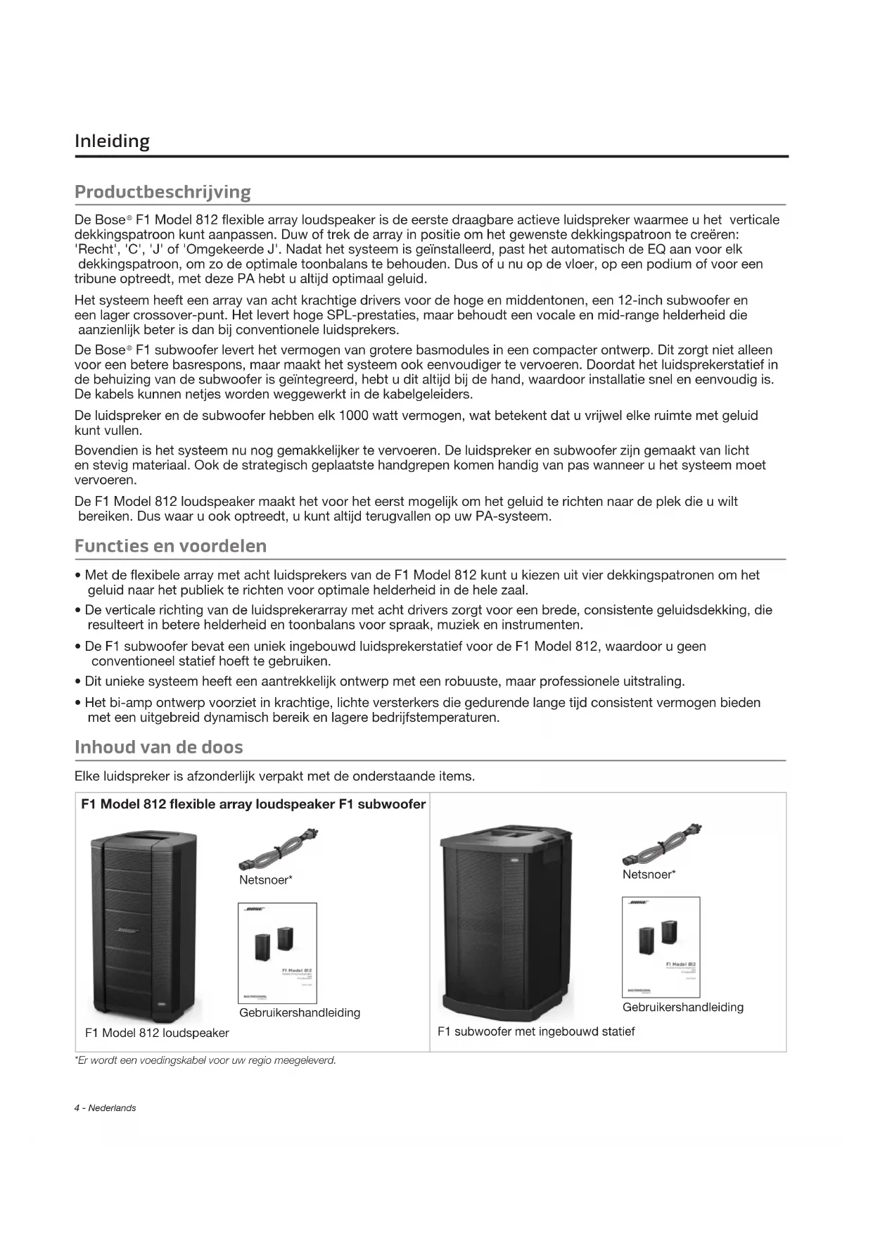 - Het bi-amp ontwerp voorziet in krachtige, lichte versterkers die gedurende lange tijd consistent vermogen bieden met een uitgebreid dynamisch bereik en lagere bedrijfstemperaturen. Inhoud van de doos Elke luidspreker is afzonderlijk verpakt met de onderstaande items. F1 Model 812 flexible array loudspeaker F1 subwoofer Netsnoer* Gebruikershandleiding F1 Model 812 loudspeaker Netsnoer* Gebruikershandleiding F1 subwoofer met ingebouwd statief *Er wordt een voedingskabel voor uw regio meegeleverd.Nederlands - 5 Inleiding F1 Model 812 flexible array loudspeaker Opmerking: De F1 Model 812 is voorzien van inzetstukken met M8-schroefdraad voor het bevestigen van accessoirebeugels. WAARSCHUWING: Alleen professionele installateurs met kennis van het juiste gereedschap en veilige montagetechnieken mogen luidsprekers hoog ophangen. BOVENKANT VOORKANT ACHTERKANT Flexibele array Handgreep Handgreep Led-lampje voorzijde Aansluitingen en knoppen Inzetstukken met M8-schroefdraad Inzetstukken met M8-schroefdraad F1 subwoofer BOVENKANT VOORKANT ACHTERKANT Handgreep Handgreep Led-lampje voorzijde Aansluitingen en knoppen Ingebouwd