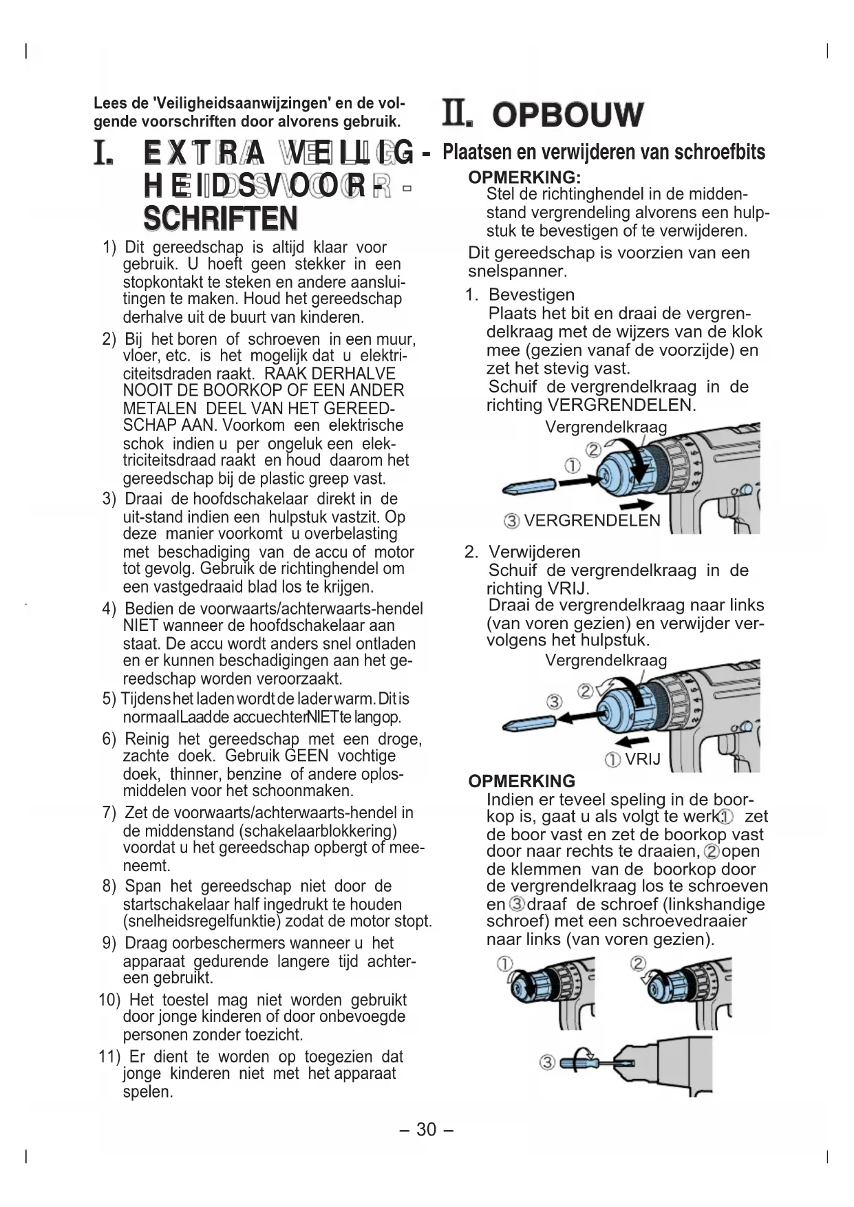 Schuif de vergrendelkraag in de richting VRIJ. Draai de vergrendelkraag naar links (van voren gezien) en verwijder ver- volgens het hulpstuk. Vergrendelkraag VRIJ OPMERKING Indien er teveel speling in de boor- kop is, gaat u als volgt te werk: zet de boor vast en zet de boorkop vast door naar rechts te draaien, open de klemmen van de boorkop door de vergrendelkraag los te schroeven