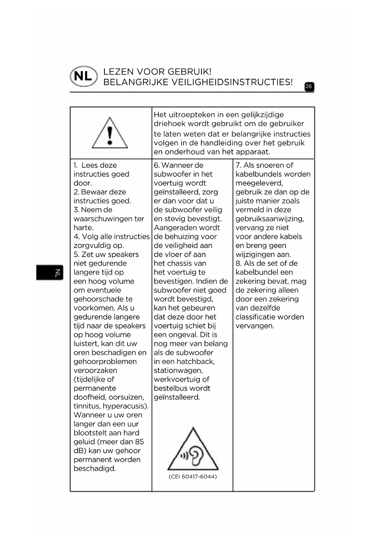 - Reinig voor het monteren van de speakers de behuizing zorgvuldig. Dankzij de prestaties van de subwoofers P 20 FE, P 25 FE, P 20 FSE en P 25 FSE kan een hoog geluidsniveau worden gegenereerd. We willen u erop wijzen dat het langdurig luisteren naar muziek met een geluidsniveau van meer dan 85 dB SPL kan leiden tot permanente gehoorschade. We raden u dan ook aan het volume van uw apparatuur dienovereenkomstig aan te passen. Aanpassingsperiode De speakers P 20 FE, P 25 FE, P 20 FSE en P 25 FSE bestaan uit complexe mechanische onderdelen die een aanpassingsperiode vereisen om optimaal te werken en zich aan te passen aan de temperatuuromstandigheden en luchtvochtigheid van uw omgeving. Deze aanpassingsperiode verschilt naargelang de omstandigheden en kan verschillende weken duren. Om dit proces te versnellen, kunt u de speakers ongeveer twintig uur achter elkaar met een gemiddeld geluidsniveau laten werken, met rijke muziek op een lage frequentie. Zodra de speakers helemaal zijn gestabiliseerd, kunt u ten volle genieten van de prestaties van uw subwoofers P 20 FE, P 25 FE, P 20 FSE en P 25 FSE. NLABY PRZECZYTAĆ NAJPIERW! WAŻNE PRZEPISY BEZPIECZEŃSTWA! Wykrzyknik wpisany w trójkąt równoramienny ma na celu ostrzeżenie użytkownika o obecności w instrukcji ważnych informacji, które dotyczą eksploatacji i konserwacji urządzenia.