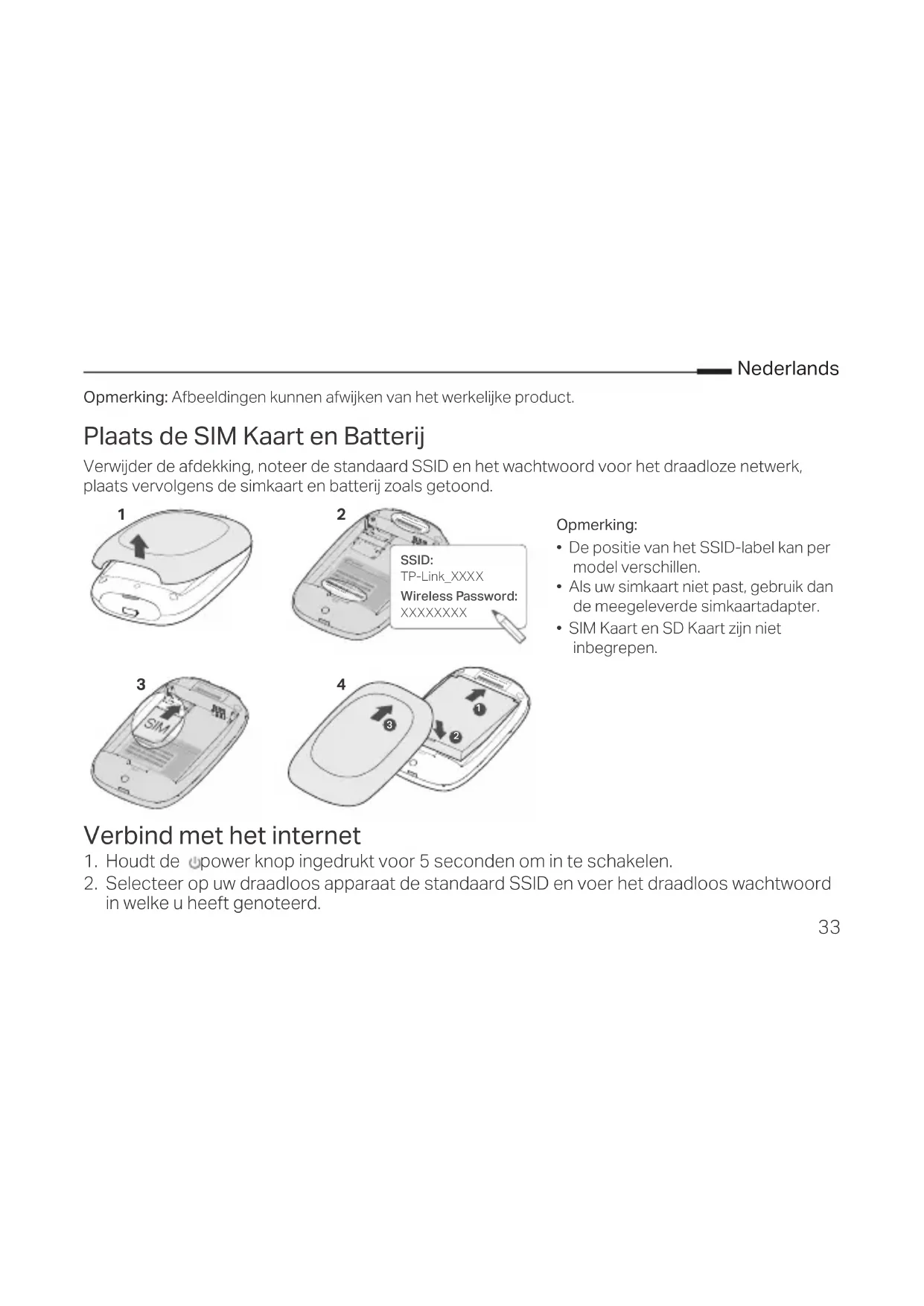 - De positie van het SSID-label kan per model verschillen.• Als uw simkaart niet past, gebruik dan de meegeleverde simkaartadapter.• SIM Kaart en SD Kaart zijn niet inbegrepen.34 Nederlands Opmerking: We raden sterk aan dat u de standaard draadloze naam en wachtwoord voor beveiligingsrede- nen wijzigd. Geniet! Opmerking: