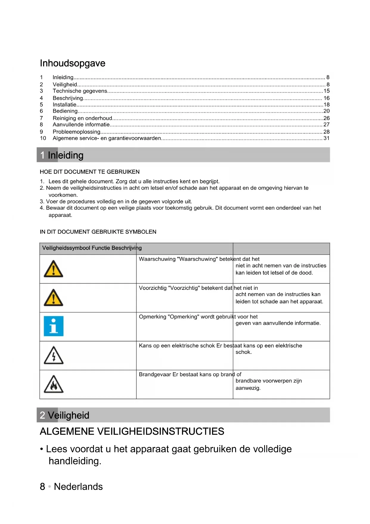 Veiligheidssymbool Functie Beschrijving Waarschuwing "Waarschuwing" betekent dat het niet in acht nemen van de instructies kan leiden tot letsel of de dood. Voorzichtig "Voorzichtig" betekent dat het niet in acht nemen van de instructies kan leiden tot schade aan het apparaat. Opmerking "Opmerking" wordt gebruikt voor het geven van aanvullende informatie. Kans op een elektrische schok Er bestaat kans op een elektrische schok. Brandgevaar Er bestaat kans op brand of brandbare voorwerpen zijn aanwezig. 2 Veiligheid ALGEMENE VEILIGHEIDSINSTRUCTIES