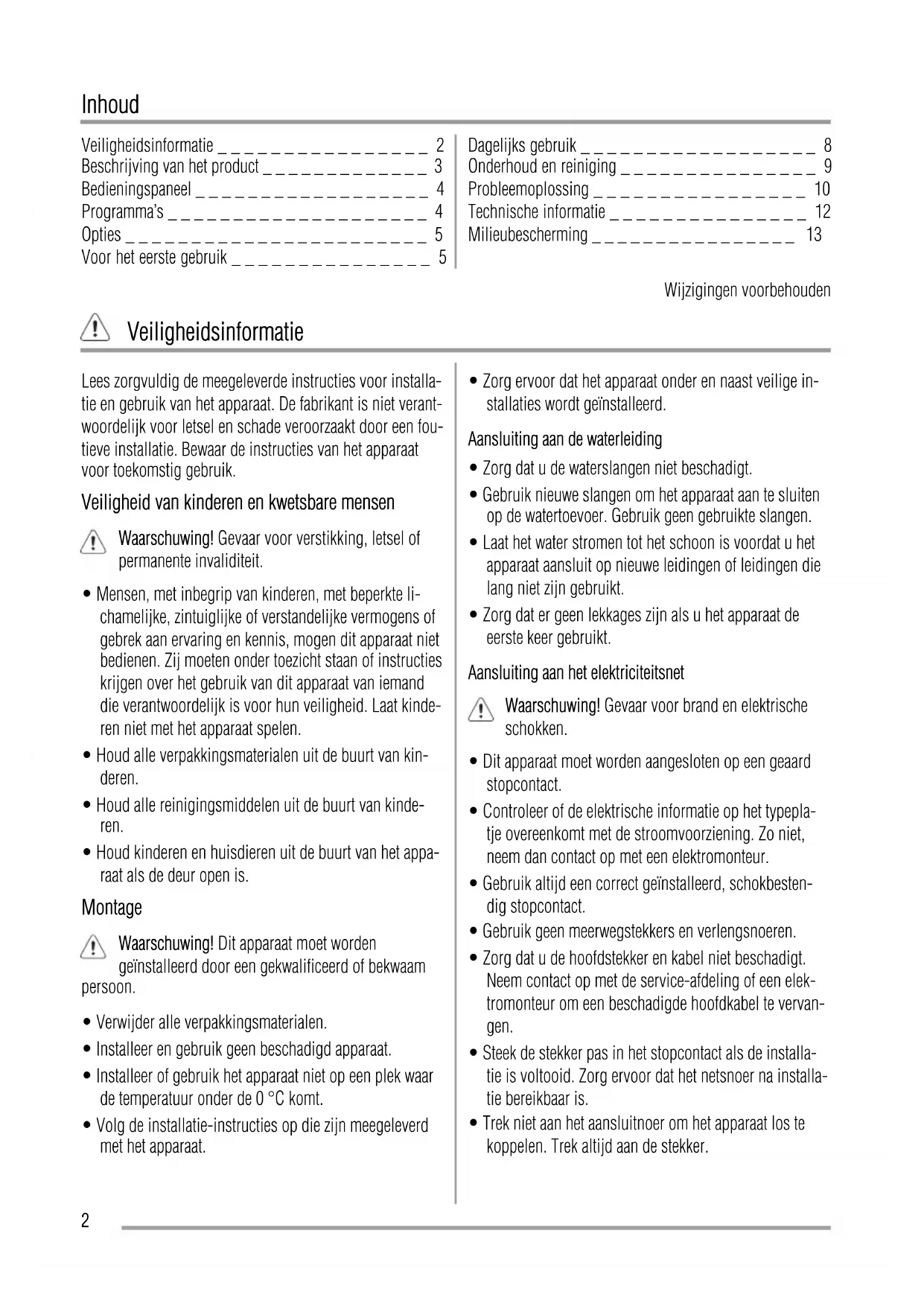 Manual de instruções 63 Afwasautomaat Dishwasher Lave-vaisselle Geschirrspüler Lavastoviglie Máquina de lavar loiça ZDT11001Inhoud Veiligheidsinformatie _ _ _ _ _ _ _ _ _ _ _ _ _ _ _ _ 2 Beschrijving van het product _ _ _ _ _ _ _ _ _ _ _ _ _ 3 Bedieningspaneel _ _ _ _ _ _ _ _ _ _ _ _ _ _ _ _ _ _ 4 Programma’s _ _ _ _ _ _ _ _ _ _ _ _ _ _ _ _ _ _ _ _ 4 Opties _ _ _ _ _ _ _ _ _ _ _ _ _ _ _ _ _ _ _ _ _ _ _ 5 Voor het eerste gebruik _ _ _ _ _ _ _ _ _ _ _ _ _ _ _ 5 Dagelijks gebruik _ _ _ _ _ _ _ _ _ _ _ _ _ _ _ _ _ _ 8 Onderhoud en reiniging _ _ _ _ _ _ _ _ _ _ _ _ _ _ _ 9 Probleemoplossing _ _ _ _ _ _ _ _ _ _ _ _ _ _ _ _ 10 Technische informatie _ _ _ _ _ _ _ _ _ _ _ _ _ _ _ 12 Milieubescherming _ _ _ _ _ _ _ _ _ _ _ _ _ _ _ _ 13 Wijzigingen voorbehouden Veiligheidsinformatie Lees zorgvuldig de meegeleverde instructies voor installa- tie en gebruik van het apparaat. De fabrikant is niet verant- woordelijk voor letsel en schade veroorzaakt door een fou- tieve installatie. Bewaar de instructies van het apparaat voor toekomstig gebruik. Veiligheid van kinderen en kwetsbare mensen Waarschuwing! Gevaar voor verstikking, letsel of permanente invaliditeit.