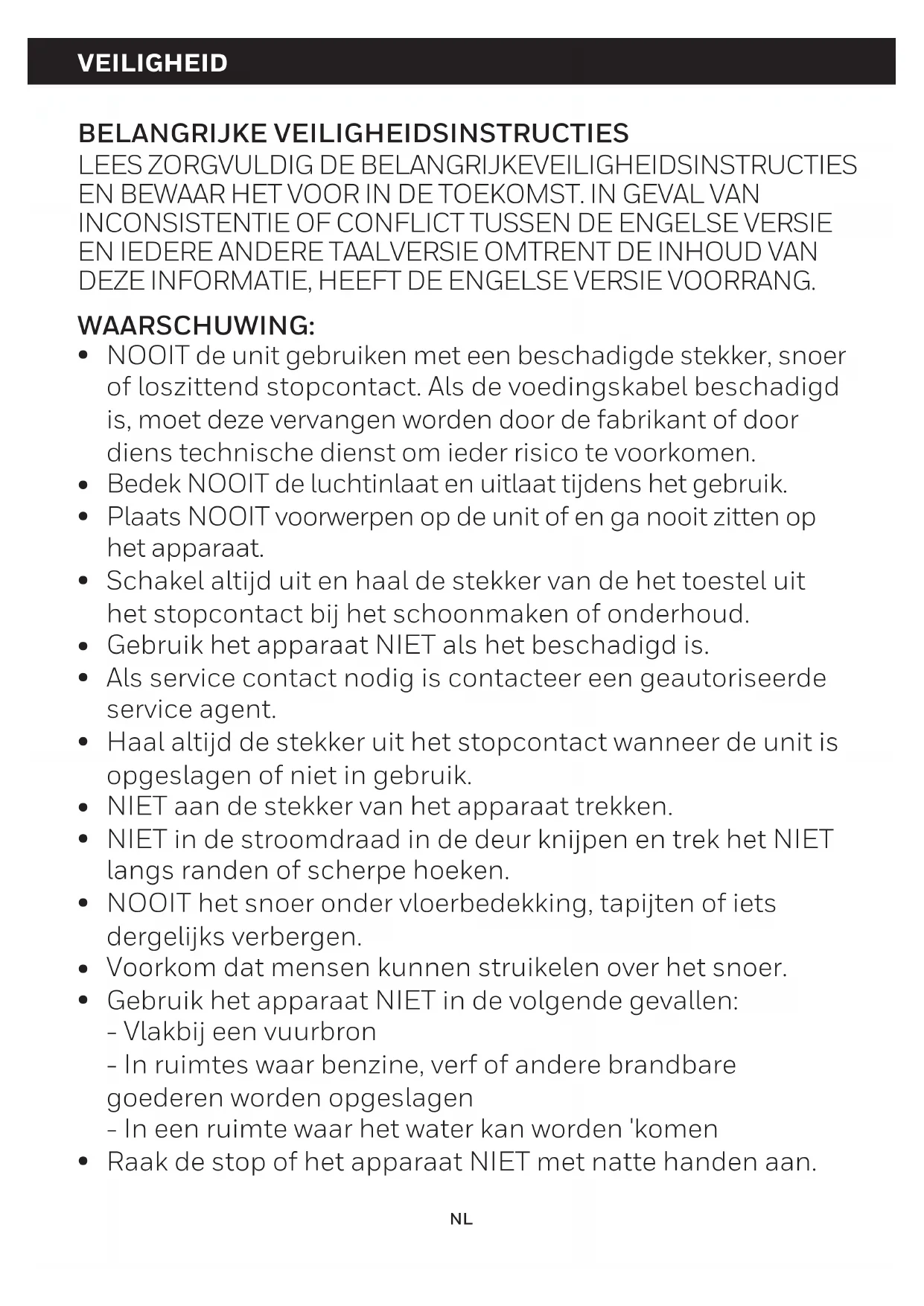 NOOIT de unit gebruiken met een beschadigde stekker, snoer of loszittend stopcontact. Als de voedingskabel beschadigd is, moet deze vervangen worden door de fabrikant of door diens technische dienst om ieder risico te voorkomen. Bedek NOOIT de luchtinlaat en uitlaat tijdens het gebruik. Plaats NOOIT voorwerpen op de unit of en ga nooit zitten op het apparaat. Schakel altijd uit en haal de stekker van de het toestel uit het stopcontact bij het schoonmaken of onderhoud. Gebruik het apparaat NIET als het beschadigd is. Als service contact nodig is contacteer een geautoriseerde service agent. Haal altijd de stekker uit het stopcontact wanneer de unit is opgeslagen of niet in gebruik. NIET aan de stekker van het apparaat trekken. NIET in de stroomdraad in de deur knijpen en trek het NIET langs randen of scherpe hoeken. NOOIT het snoer onder vloerbedekking, tapijten of iets dergelijks verbergen. Voorkom dat mensen kunnen struikelen over het snoer. Gebruik het apparaat NIET in de volgende gevallen: - Vlakbij een vuurbron - In ruimtes waar benzine, verf of andere brandbare goederen worden opgeslagen - In een ruimte waar het water kan worden 'komen Raak de stop of het apparaat NIET met natte handen aan. VEILIGHEID BELANGRIJKE VEILIGHEIDSINSTRUCTIES