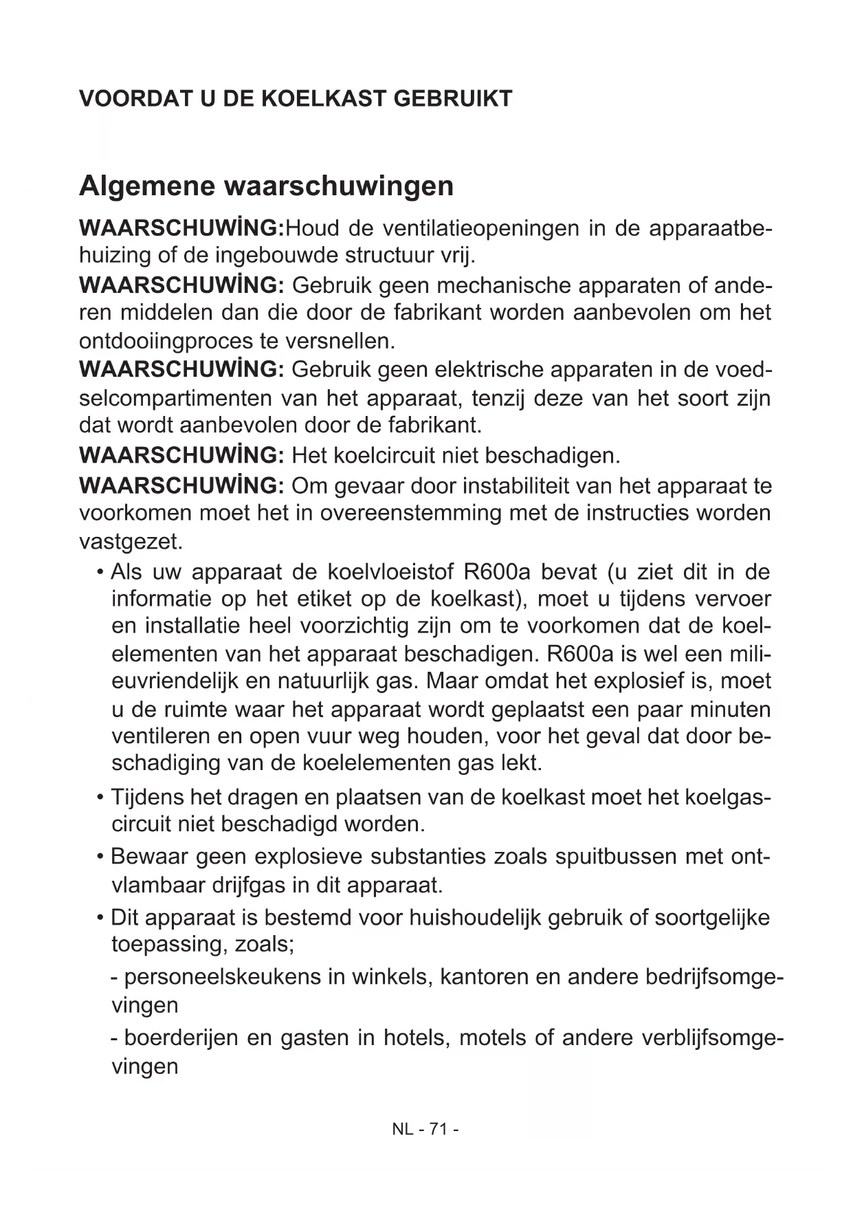 - Dit apparaat werd vervaardigd voor huishoudelijk gebruik en is uitsluitend geschikt voor het koelen / bewaren van etenswaren. Het is niet geschikt voor commercieel of gemeen- schappelijk gebruik en/of het bewaren van andere substanties dan etenswaren. Ons bedrijf is in dergelijke gevallen niet aansprakelijk voor geleden verliezen. Veiligheidswaarschuwingen