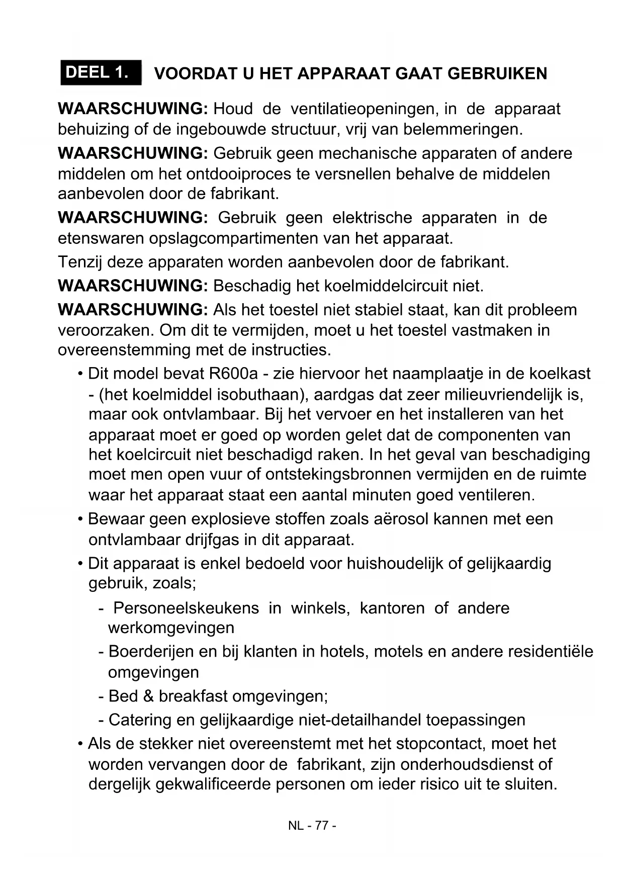 Tips om energie te besparen ......................................................................................... 94 COMPONENTI DELL’ELETTRODOMESTICO E SCOMPARTI ...........................95NL - 77 - WAARSCHUWING: Houd de ventilatieopeningen, in de apparaat behuizing of de ingebouwde structuur, vrij van belemmeringen. WAARSCHUWING: Gebruik geen mechanische apparaten of andere middelen om het ontdooiproces te versnellen behalve de middelen aanbevolen door de fabrikant. WAARSCHUWING: Gebruik geen elektrische apparaten in de etenswaren opslagcompartimenten van het apparaat. Tenzij deze apparaten worden aanbevolen door de fabrikant. WAARSCHUWING: Beschadig het koelmiddelcircuit niet. WAARSCHUWING: Als het toestel niet stabiel staat, kan dit probleem veroorzaken. Om dit te vermijden, moet u het toestel vastmaken in overeenstemming met de instructies.