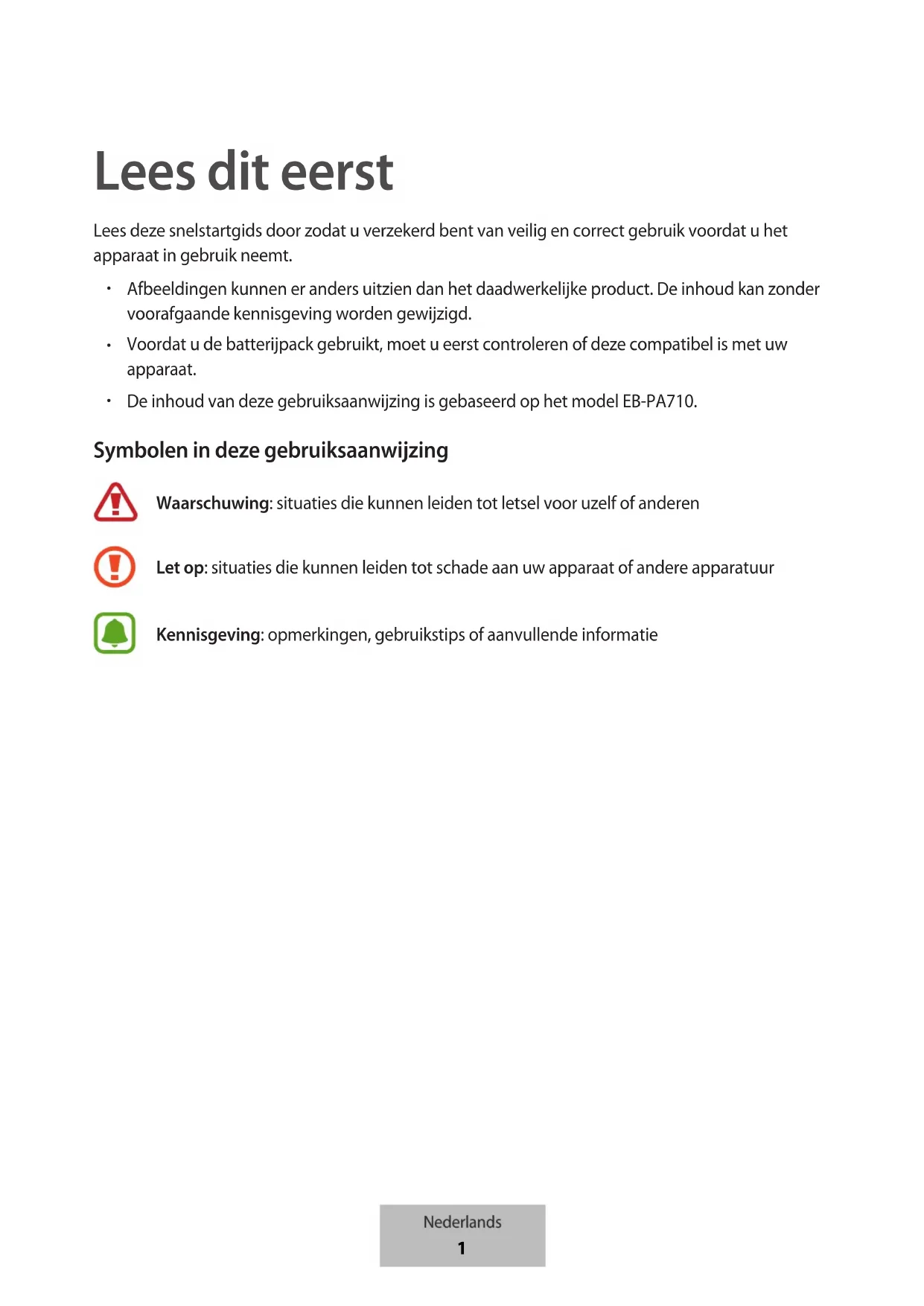 De inhoud van deze gebruiksaanwijzing is gebaseerd op het model EB-PA710. Symbolen in deze gebruiksaanwijzing Waarschuwing: situaties die kunnen leiden tot letsel voor uzelf of anderen Let op: situaties die kunnen leiden tot schade aan uw apparaat of andere apparatuur Kennisgeving: opmerkingen, gebruikstips of aanvullende informatie Nederlands