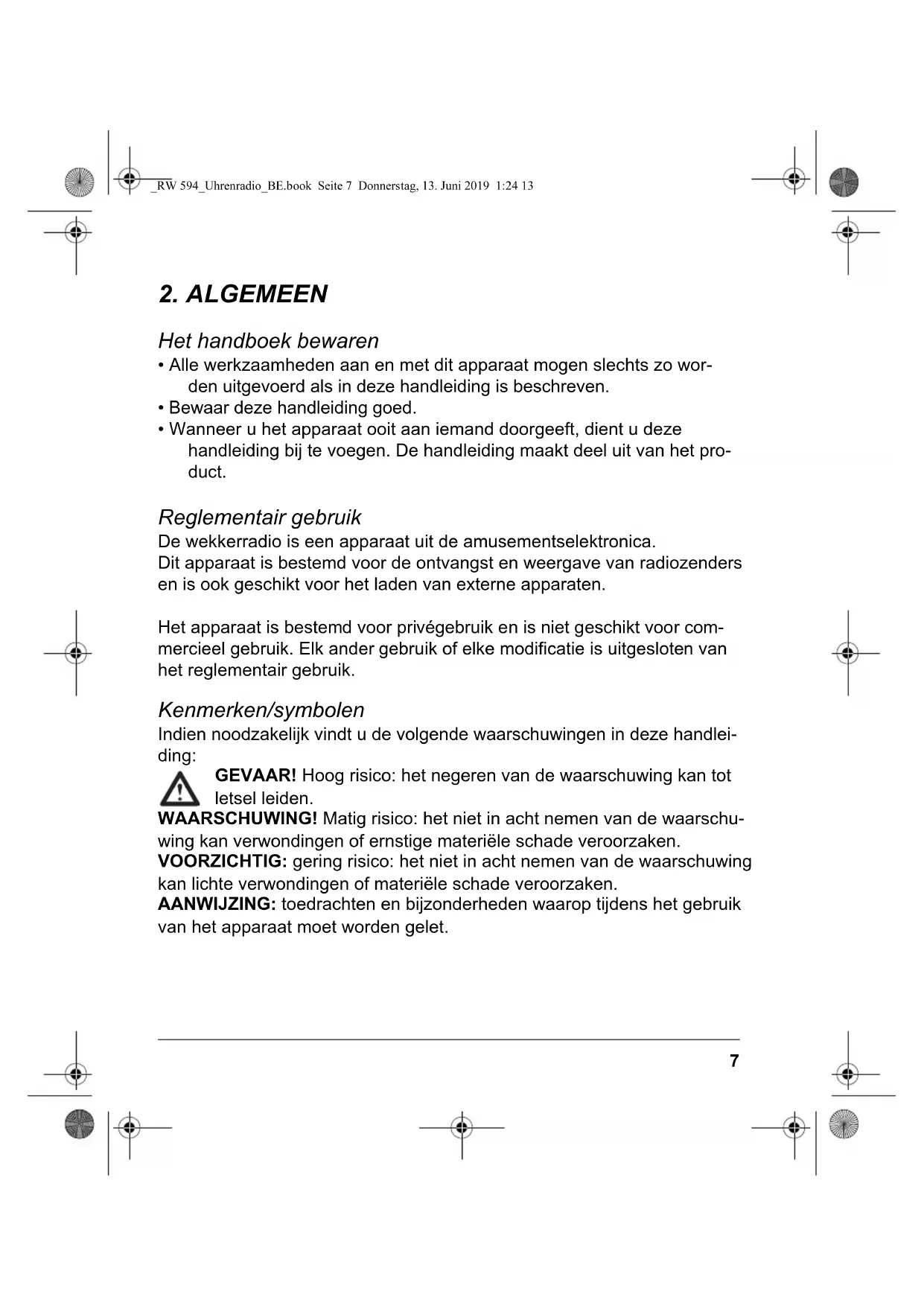 - Wanneer u het apparaat ooit aan iemand doorgeeft, dient u deze handleiding bij te voegen. De handleiding maakt deel uit van het pro- duct. Reglementair gebruik De wekkerradio is een apparaat uit de amusementselektronica. Dit apparaat is bestemd voor de ontvangst en weergave van radiozenders en is ook geschikt voor het laden van externe apparaten. Het apparaat is bestemd voor privégebruik en is niet geschikt voor com- mercieel gebruik. Elk ander gebruik of elke modificatie is uitgesloten van het reglementair gebruik. Kenmerken/symbolen Indien noodzakelijk vindt u de volgende waarschuwingen in deze handlei- ding: GEVAAR! Hoog risico: het negeren van de waarschuwing kan tot letsel leiden. WAARSCHUWING! Matig risico: het niet in acht nemen van de waarschu- wing kan verwondingen of ernstige materiële schade veroorzaken. VOORZICHTIG: gering risico: het niet in acht nemen van de waarschuwing kan lichte verwondingen of materiële schade veroorzaken. AANWIJZING: toedrachten en bijzonderheden waarop tijdens het gebruik van het apparaat moet worden gelet. _RW 594_Uhrenradio_BE.book Seite 7 Donnerstag, 13. Juni 2019 1:24 138