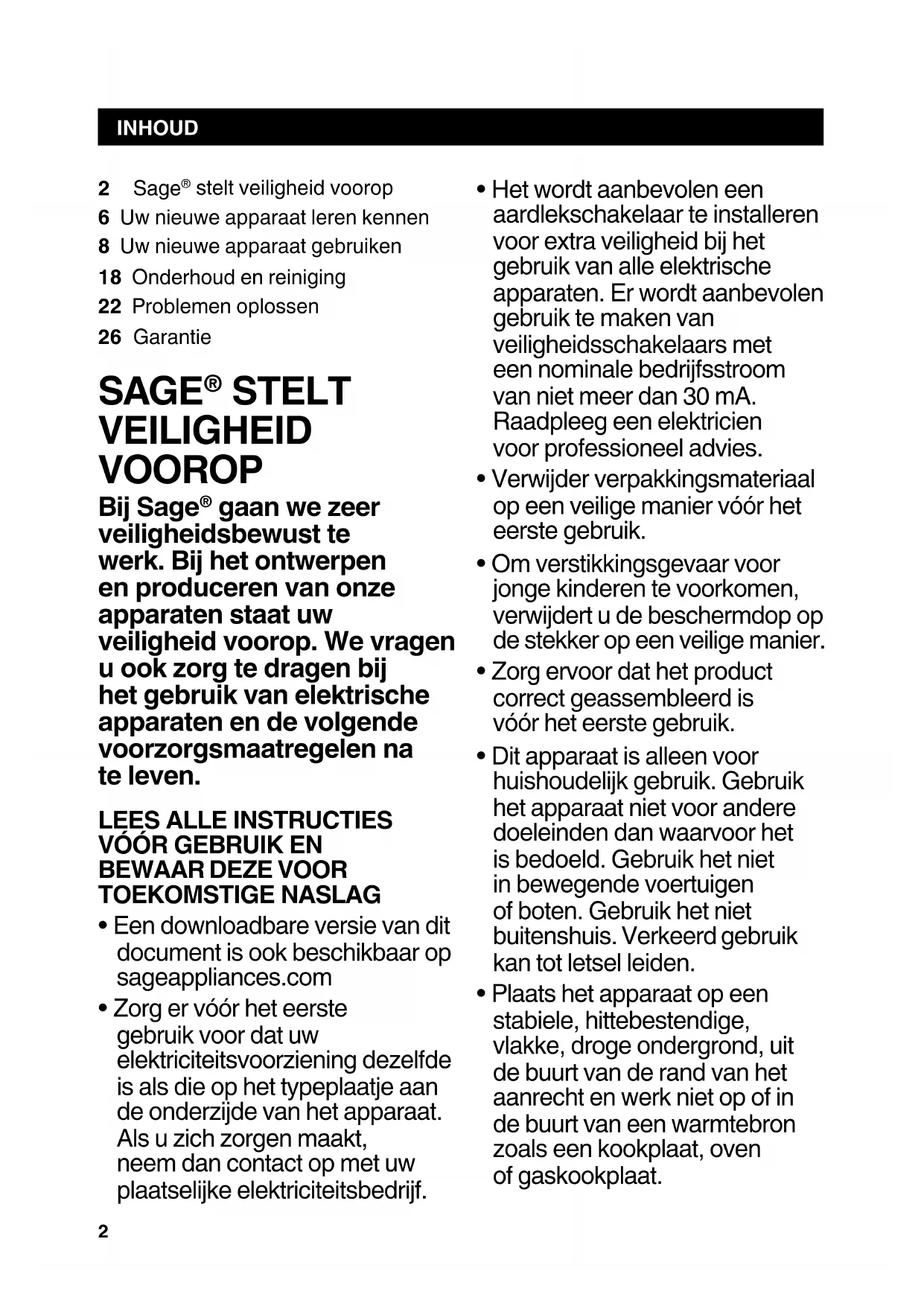 Bij Sage® gaan we zeer veiligheidsbewust te werk. Bij het ontwerpen en producereren van once apparaten staat uw voiligheid voorop. We vragen u ook zorg te dragen bij het gebruik van elektrische apparaten en de volgende voorzorgsmaatregelen na te leven.