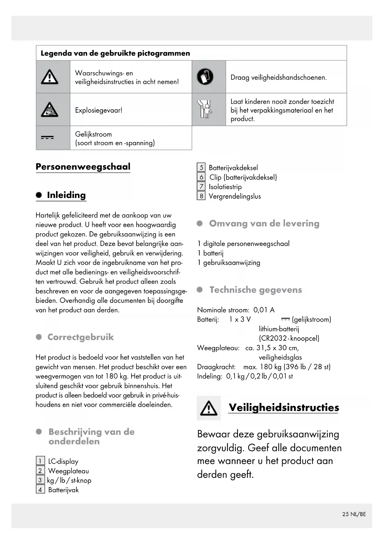 Omvang van de levering 1 digitale personenweegschaal 1 batterij 1 gebruiksaanwijzing Technische gegevens Nominale stroom: 0,01 A Batterij: 1 x 3 V (gelijkstroom) lithium-batterij (CR2032 - knoopcel) Weegplateau: ca. 31,5 x 30 cm, veiligheidsglas Draagkracht: max. 180 kg (396 lb / 28 st) Indeling: 0,1 kg / 0,2 lb / 0,01 st Veiligheidsinstructies Bewaar deze gebruiksaanwijzing zorgvuldig. Geef alle documenten mee wanneer u het product aan derden geeft.26 NL/BE LEVENSGEVAAR EN