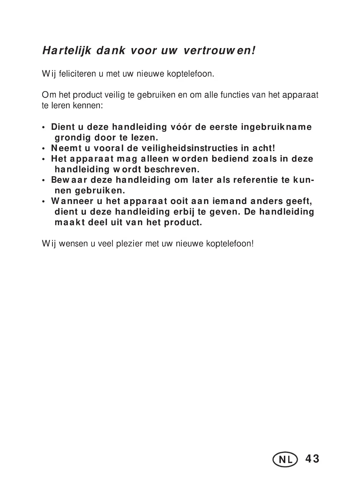 Hartelijk dank voor uw vertrouwen! Wij feliciteren u met uw nieuwe koptelefoon. Om het product veilig te gebruiken en om alle functies van het apparaat te leren kennen: