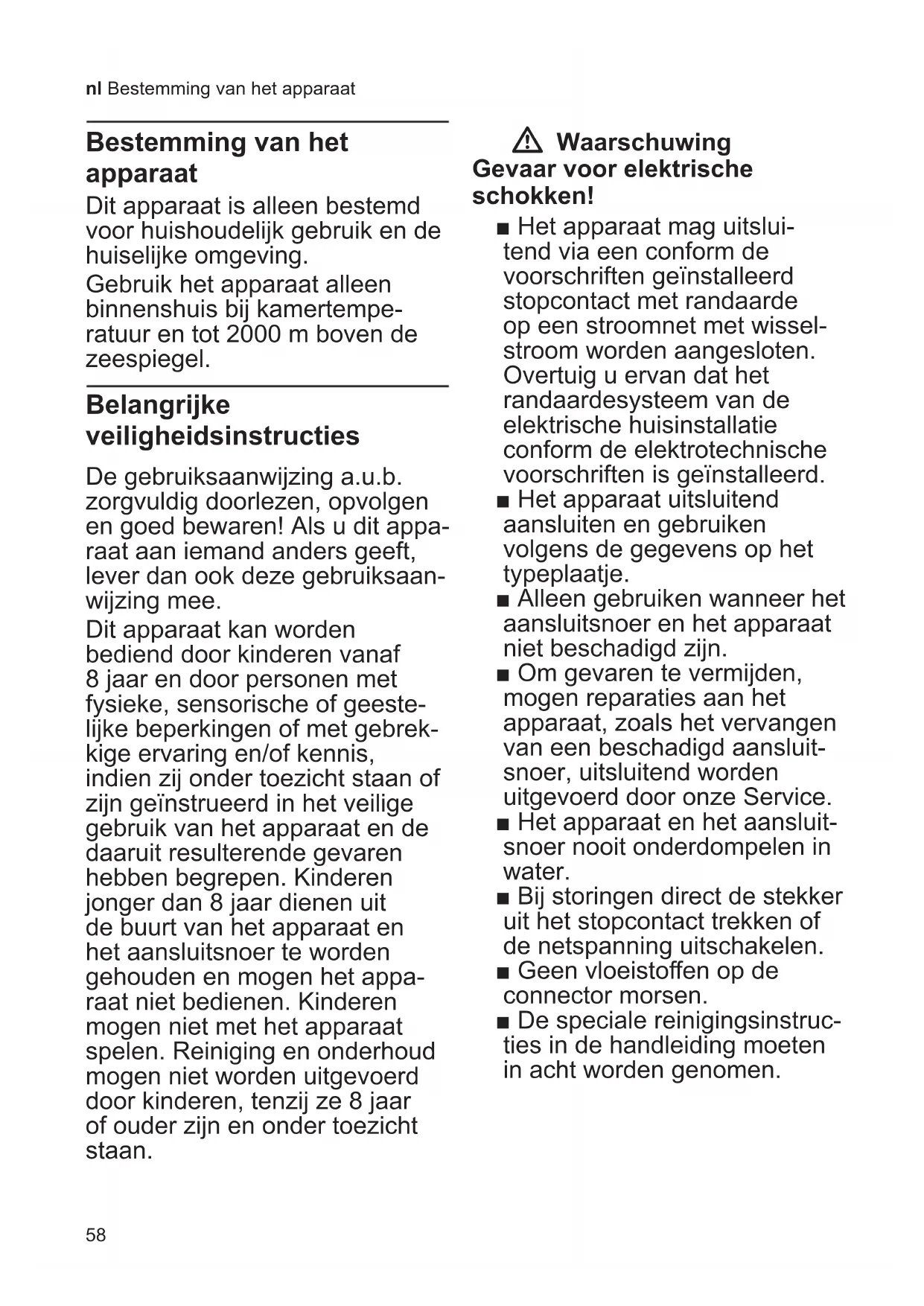 - calc‘nClean Tips voor het besparen van energie 77 Vorstbeveiliging 77 Bewaren van toebehoren 77 Toebehoren 78 Afval 78 Garantievoorwaarden78 Technische gegevens 78 Zelf eenvoudige problemen verhelpen 7958 nl Bestemmingvanhetapparaat Bestemming van het apparaat Dit apparaat is alleen bestemd voor huishoudelijk gebruik en de huiselijke omgeving. Gebruik het apparaat alleen binnenshuis bij kamertempe- ratuur en tot 2000 m boven de zeespiegel. Belangrijke veiligheidsinstructies De gebruiksaanwijzing a.u.b. zorgvuldig doorlezen, opvolgen en goed bewaren! Als u dit appa- raat aan iemand anders geeft, lever dan ook deze gebruiksaan- wijzing mee. Dit apparaat kan worden bediend door kinderen vanaf 8 jaar en door personen met fysieke, sensorische of geeste- lijke beperkingen of met gebrek- kige ervaring en/of kennis, indien zij onder toezicht staan of zijn geïnstrueerd in het veilige gebruik van het apparaat en de daaruit resulterende gevaren hebben begrepen. Kinderen jonger dan 8 jaar dienen uit de buurt van het apparaat en het aansluitsnoer te worden gehouden en mogen het appa- raat niet bedienen. Kinderen mogen niet met het apparaat spelen. Reiniging en onderhoud mogen niet worden uitgevoerd door kinderen, tenzij ze 8 jaar of ouder zijn en onder toezicht staan. W Waarschuwing Gevaar voor elektrische schokken! ■ Het apparaat mag uitslui- tend via een conform de voorschriften geïnstalleerd stopcontact met randaarde op een stroomnet met wissel- stroom worden aangesloten. Overtuig u ervan dat het randaardesysteem van de elektrische huisinstallatie conform de elektrotechnische voorschriften is geïnstalleerd. ■ Het apparaat uitsluitend aansluiten en gebruiken volgens de gegevens op het typeplaatje. ■ Alleen gebruiken wanneer het aansluitsnoer en het apparaat niet beschadigd zijn. ■ Om gevaren te vermijden, mogen reparaties aan het apparaat, zoals het vervangen van een beschadigd aansluit- snoer, uitsluitend worden uitgevoerd door onze Service. ■ Het apparaat en het aansluit- snoer nooit onderdompelen in water. ■ Bij storingen direct de stekker uit het stopcontact trekken of de netspanning uitschakelen. ■ Geen vloeistoen op de connector morsen. ■ De speciale reinigingsinstruc- ties in de handleiding moeten in acht worden genomen. Bestemming van het apparaat Belangrijke veiligheidsinstructies 59 p. 76