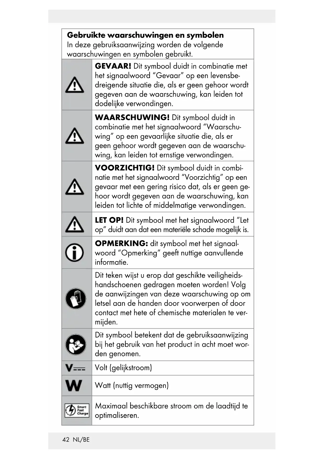 - Bij gelijktijdig gebruik van alle uitgangen mag de totaal opgenomen stroom van de aangesloten apparaten 3 A niet overschrijden. Veiligheidsinstructies Maak uzelf voor de ingebruikname van het product met alle gebruiksinstructies en veiligheidsvoorschriften vertrouwd. Overhandig alle documenten bij doorgifte van het product aan derden. Controleer het product voor gebruik op zichtbare bescha- digingen. Neem een beschadigd of gevallen product niet in gebruik. Dit product kan door kinderen vanaf 8 alsmede door personen met verminderde fysieke, sensorische of men- tale vaardigheden of een gebrek aan ervaring en kennis worden gebruikt, als zij onder toezicht staan of geïnstru- eerd werden met betrekking tot het veilige gebruik van het product en als ze de hieruit voortvloeiende gevaren begrijpen. Kinderen mogen niet met het product spelen. Reiniging en gebruikersonderhoud mag niet door kinderen zonder toezicht worden uitgevoerd. GEVAAR! Het verpakkingsmateriaal is geen speel- goed. Houd al het verpakkingsmateriaal uit de buurt van kinderen. Er bestaat verstikkingsgevaar! Gebruik het product altijd op een stabiele en vlakke ondergrond. Als het valt kan het beschadigd raken. Stel het product niet bloot aan direct zonlicht of hoge temperaturen. Anders kan het oververhitten en onherstel- baar beschadigd raken.46 NL/BE Gebruik het product niet in de buurt van warmtebronnen zoals radiatoren of andere warmtegenererende apparaten. Gebruik het product niet in de buurt van open vuur. Het product is niet geschikt voor het gebruik in ruimtes met hoge temperatuur of luchtvochtigheid (bijv. badkamer) of overmatige hoeveelheden stof. Let erop dat er geen vreemde voorwerpen in het binnen- ste van het product terecht kunnen komen. Stel het product nooit bloot aan extreme hitte. Dit geldt in het bijzonder voor de opslag in de auto. Als de auto langer stil staat ontstaan extreme temperaturen in de bin- nenruimte en handschoenkastje. Verwijder elektrische en elektronische apparaten uit het voertuig. Gebruik het product niet direct, als het van een koude omgeving in een warme omgeving werd gebracht. Laat het product eerst op temperatuur komen voordat u het inschakelt. WAARSCHUWING Open nooit de behuizing van het product. Er bevinden zich geen te onderhouden com- ponenten in het product. Voer geen eigenhandige veranderingen uit aan het product. Laat reparaties aan het product alleen door geautori- seerde speciale bedrijven of door de klantenservice uitvoeren. Door ondeskundige reparaties kan aanzienlijk gevaar voor letsel voor de gebruiker ontstaan. Bovendien komt de garantie te vervallen. Stel het product niet bloot aan spat- en / of drupwater en plaats geen met vloeistof gevulde voorwerpen zoals vazen of glazen op of naast het product. Schakel het product direct uit en trek de eventueel aan- geslotenlaadkabel van het product, indien u een brand- geur of rookontwikkeling constateert. Laat het product door een gekwalificeerde specialist controleren, voordat u het opnieuw gebruikt. Bij gebruik van een USB-lader moet het gebruikte stop- contact altijd goed toegankelijk zijn, zodat in een ge- vaarlijke situatie de USB-stekker snel uit het stopcontact47 NL/BE kan worden getrokken. Houd daarbij de gebruiksaan- wijzing van de fabrikant in acht. WAARSCHUWING Een verkeerde omgang met lithium-polymeer accu‘s kan leiden tot brand, explosies, lekken van gevaarlijke stoffen of andere gevaarlijke situ- aties! Gooi het product niet in het vuur aangezien de geïntegreerde accu kan exploderen. Neem de gebruiksbeperkingen resp. de gebruiksverbo- den voor op accu werkende producten op locaties met speciale gevarensituaties, zoals bijv. tankstations, vlieg- tuigen, ziekenhuizen, etc. in acht. WAARSCHUWING dek het product tijdens het la- den nooit af. Hierdoor kan het product oververhit raken. Ingebruikname en bediening Powerbank laden Gebruik vanwege de hoge stroomopname van de power- bank nooit een laptop- of PC-USB-aansluiting om de powerbank op te laden. Gebruik voor het opladen van de powerbank uitsluitend een geschikte USB-transformator (5 V , min. 3 A; niet inbegrepen). Voor het gebruik van het product moet de geïntegreerde accu volledig worden opgeladen. Gebruik voor het laden van de powerbank