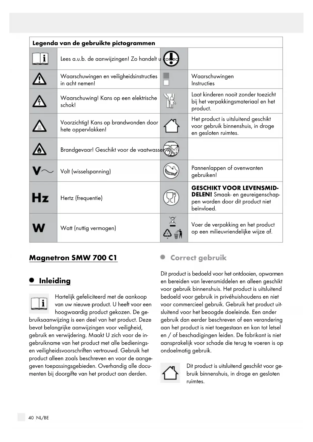 Voer de verpakking en het product op een milieuvriendelijke wijze af. Magnetron SMW 700 C1 Inleiding Hartelijk gefeliciteerd met de aankoop van uw nieuwe product. U heeft voor een hoogwaardig product gekozen. De ge- bruiksaanwijzing is een deel van het product. Deze bevat belangrijke aanwijzingen voor veiligheid, gebruik en verwijdering. Maakt U zich voor de in- gebruikname van het product met alle bedienings- en veiligheidsvoorschriften vertrouwd. Gebruik het product alleen zoals beschreven en voor de aange- geven toepassingsgebieden. Overhandig alle docu- menten bij doorgifte van het product aan derden. Correct gebruik Dit product is bedoeld voor het ontdooien, opwarm