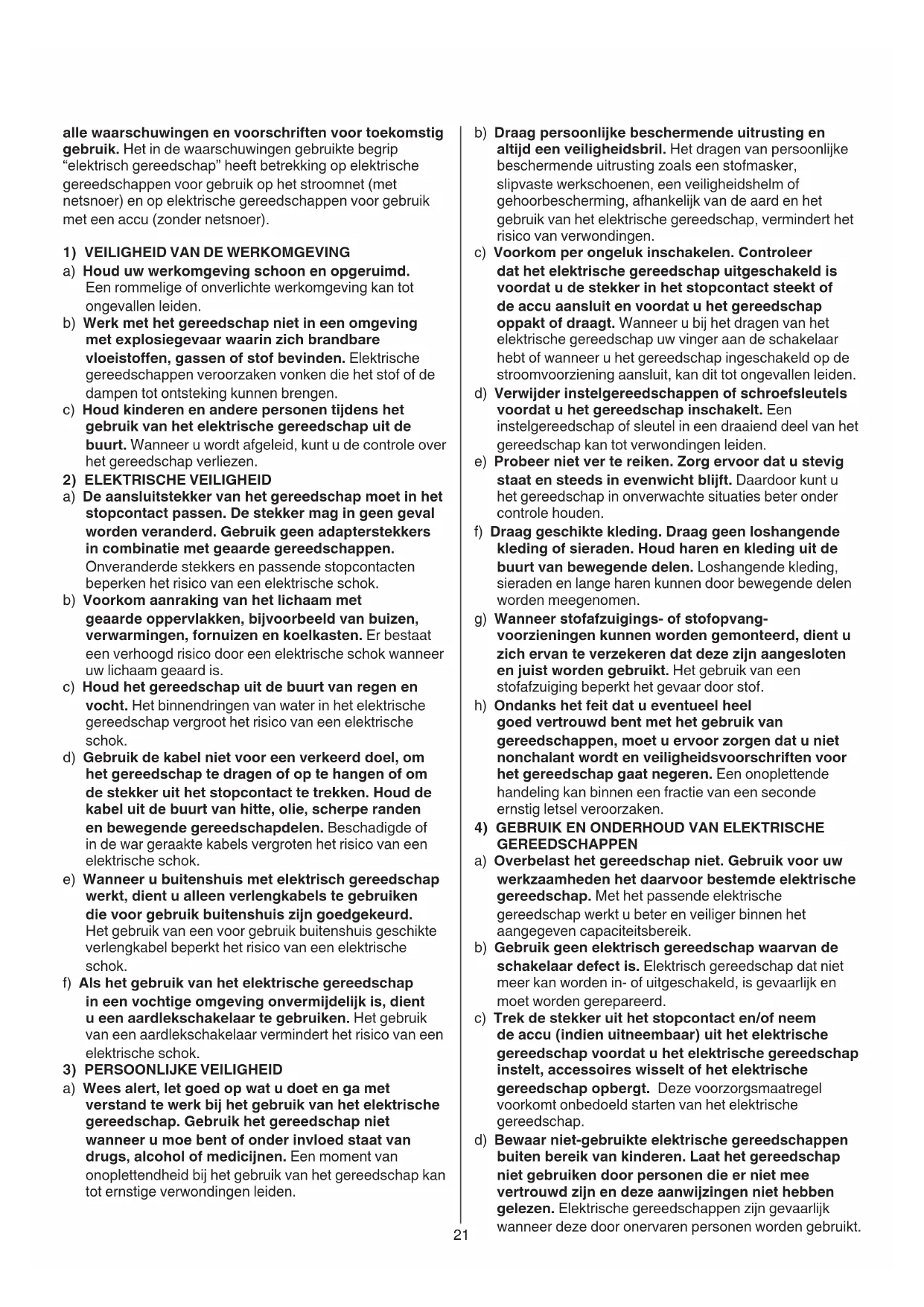 a) Wees alert, let goed op wat u doet en ga met verstand te werk bij het gebruik van het elektrische gereedschap. Gebruik het gereedschap niet wanneer u moe bent of onder invloed staat van drugs, alcohol of medicijnen. Een moment van onoplettendheid bij het gebruik van het gereedschap kan tot ernstige verwondingen leiden.22