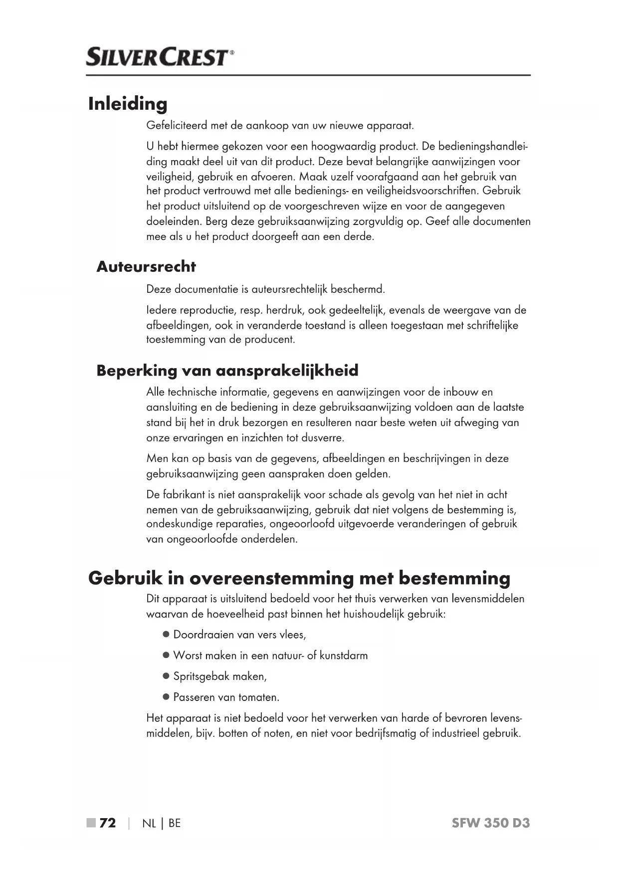 SFW 350 D3 Inleiding Gefeliciteerd met de aankoop van uw nieuwe apparaat. U hebt hiermee gekozen voor een hoogwaardig product. De bedieningshandlei- ding maakt deel uit van dit product. Deze bevat belangrijke aanwijzingen voor veiligheid, gebruik en afvoeren. Maak uzelf voorafgaand aan het gebruik van het product vertrouwd met alle bedienings- en veiligheidsvoorschriften. Gebruik het product uitsluitend op de voorgeschreven wijze en voor de aangegeven doeleinden. Berg deze gebruiksaanwijzing zorgvuldig op. Geef alle documenten mee als u het product doorgeeft aan een derde. Auteursrecht Deze documentatie is auteursrechtelijk beschermd. Iedere reproductie, resp. herdruk, ook gedeeltelijk, evenals de weergave van de afbeeldingen, ook in veranderde toestand is alleen toegestaan met schriftelijke toestemming van de producent. Beperking van aansprakelijkheid Alle technische informatie, gegevens en aanwijzingen voor de inbouw en aansluiting en de bediening in deze gebruiksaanwijzing voldoen aan de laatste stand bij het in druk bezorgen en resulteren naar beste weten uit afweging van onze ervaringen en inzichten tot dusverre. Men kan op basis van de gegevens, afbeeldingen en beschrijvingen in deze gebruiksaanwijzing geen aanspraken doen gelden. De fabrikant is niet aansprakelijk voor schade als gevolg van het niet in acht nemen van de gebruiksaanwijzing, gebruik dat niet volgens de bestemming is, ondeskundige reparaties, ongeoorloofd uitgevoerde veranderingen of gebruik van ongeoorloofde onderdelen. Gebruik in overeenstemming met bestemming Dit apparaat is uitsluitend bedoeld voor het thuis verwerken van levensmiddelen waarvan de hoeveelheid past binnen het huishoudelijk gebruik: ▯ Doordraaien van vers vlees, ▯ Worst maken in een natuur- of kunstdarm ▯ Spritsgebak maken, ▯ Passeren van tomaten. Het apparaat is niet bedoeld voor het verwerken van harde of bevroren levens- middelen, bijv. botten of noten, en niet voor bedrijfsmatig of industrieel gebruik. IB_314659_SFW350D3_LB8.indb 72 21.01.19 14:53NL