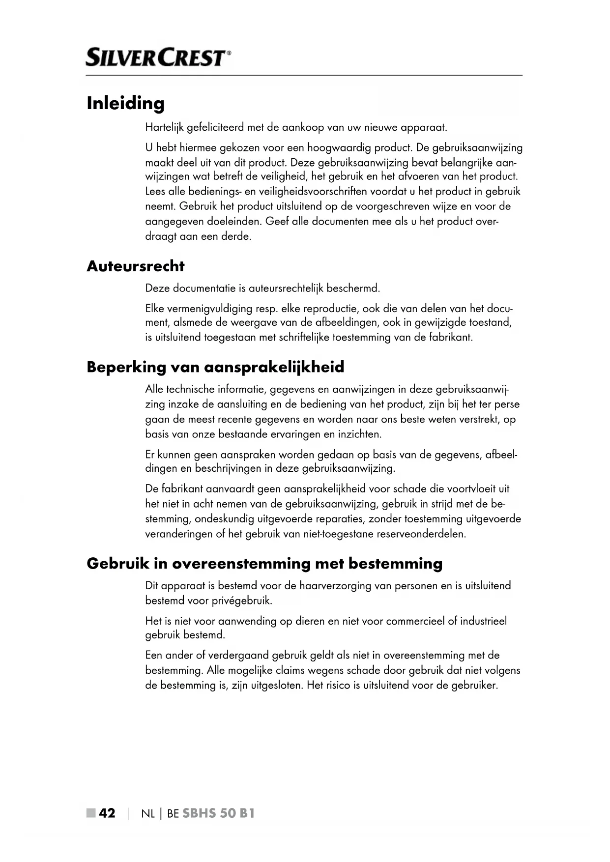 Inleiding Hartelijk gefeliciteerd met de aankoop van uw nieuwe apparaat. U hebt hiermee gekozen voor een hoogwaardig product. De gebruiksaanwijzing maakt deel uit van dit product. Deze gebruiksaanwijzing bevat belangrijke aan- wijzingen wat betreft de veiligheid, het gebruik en het afvoeren van het product. Lees alle bedienings- en veiligheidsvoorschriften voordat u het product in gebruik neemt. Gebruik het product uitsluitend op de voorgeschreven wijze en voor de aangegeven doeleinden. Geef alle documenten mee als u het product over- draagt aan een derde. Auteursrecht Deze documentatie is auteursrechtelijk beschermd. Elke vermenigvuldiging resp. elke reproductie, ook die van delen van het docu- ment, alsmede de weergave van de afbeeldingen, ook in gewijzigde toestand, is uitsluitend toegestaan met schriftelijke toestemming van de fabrikant. Beperking van aansprakelijkheid Alle technische informatie, gegevens en aanwijzingen in deze gebruiksaanwij- zing inzake de aansluiting en de bediening van het product, zijn bij het ter perse gaan de meest recente gegevens en worden naar ons beste weten verstrekt, op basis van onze bestaande ervaringen en inzichten. Er kunnen geen aanspraken worden gedaan op basis van de gegevens, afbeel- dingen en beschrijvingen in deze gebruiksaanwijzing. De fabrikant aanvaardt geen aansprakelijkheid voor schade die voortvloeit uit het niet in acht nemen van de gebruiksaanwijzing, gebruik in strijd met de be- stemming, ondeskundig uitgevoerde reparaties, zonder toestemming uitgevoerde veranderingen of het gebruik van niet-toegestane reserveonderdelen. Gebruik in overeenstemming met bestemming Dit apparaat is bestemd voor de haarverzorging van personen en is uitsluitend bestemd voor privégebruik. Het is niet voor aanwending op dieren en niet voor commercieel of industrieel gebruik bestemd. Een ander of verdergaand gebruik geldt als niet in overeenstemming met de bestemming. Alle mogelijke claims wegens schade door gebruik dat niet volgens de bestemming is, zijn uitgesloten. Het risico is uitsluitend voor de gebruiker.NL