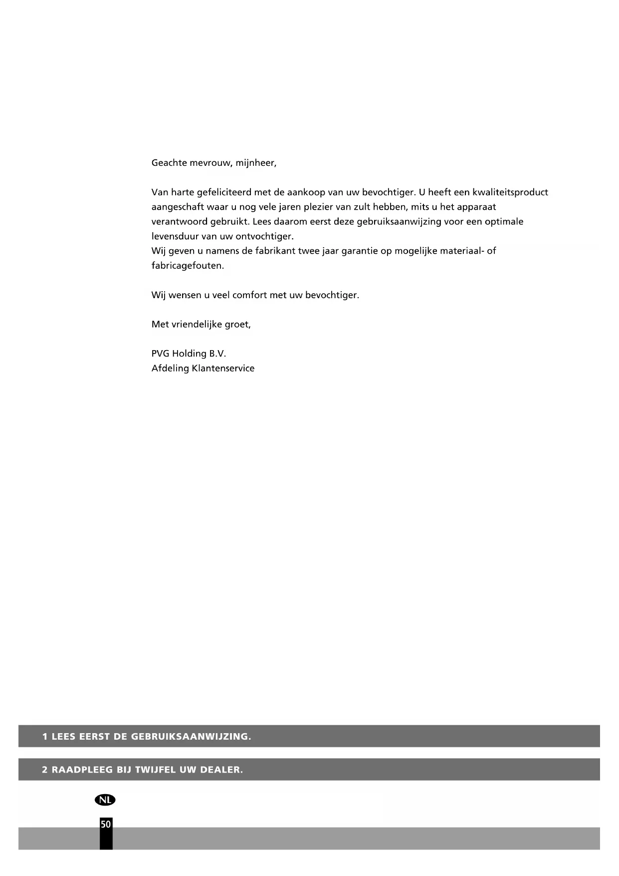 Geachte mevrouw, mijnheer, Van harte gefeliciteerd met de aankoop van uw bevochtiger. U heeft een kwaliteitsproduct aangeschaft waar u nog vele jaren plezier van zult hebben, mits u het apparaat verantwoord gebruikt. Lees daarom eerst deze gebruiksaanwijzing voor een optimale levensduur van uw ontvochtiger. Wij geven u namens de fabrikant twee jaar garantie op mogelijke materiaal- of fabricagefouten. Wij wensen u veel comfort met uw bevochtiger. Met vriendelijke groet, PVG Holding B.V. Afdeling KlantenserviceBELANGRIJKE ONDERDELEN Mistsproeier Geurdoos Watertank Wateronthardingsfilter (niet bijgeleverd) Ultrasone transducer PTC verwarmingselement Asklep Bedieningspaneel