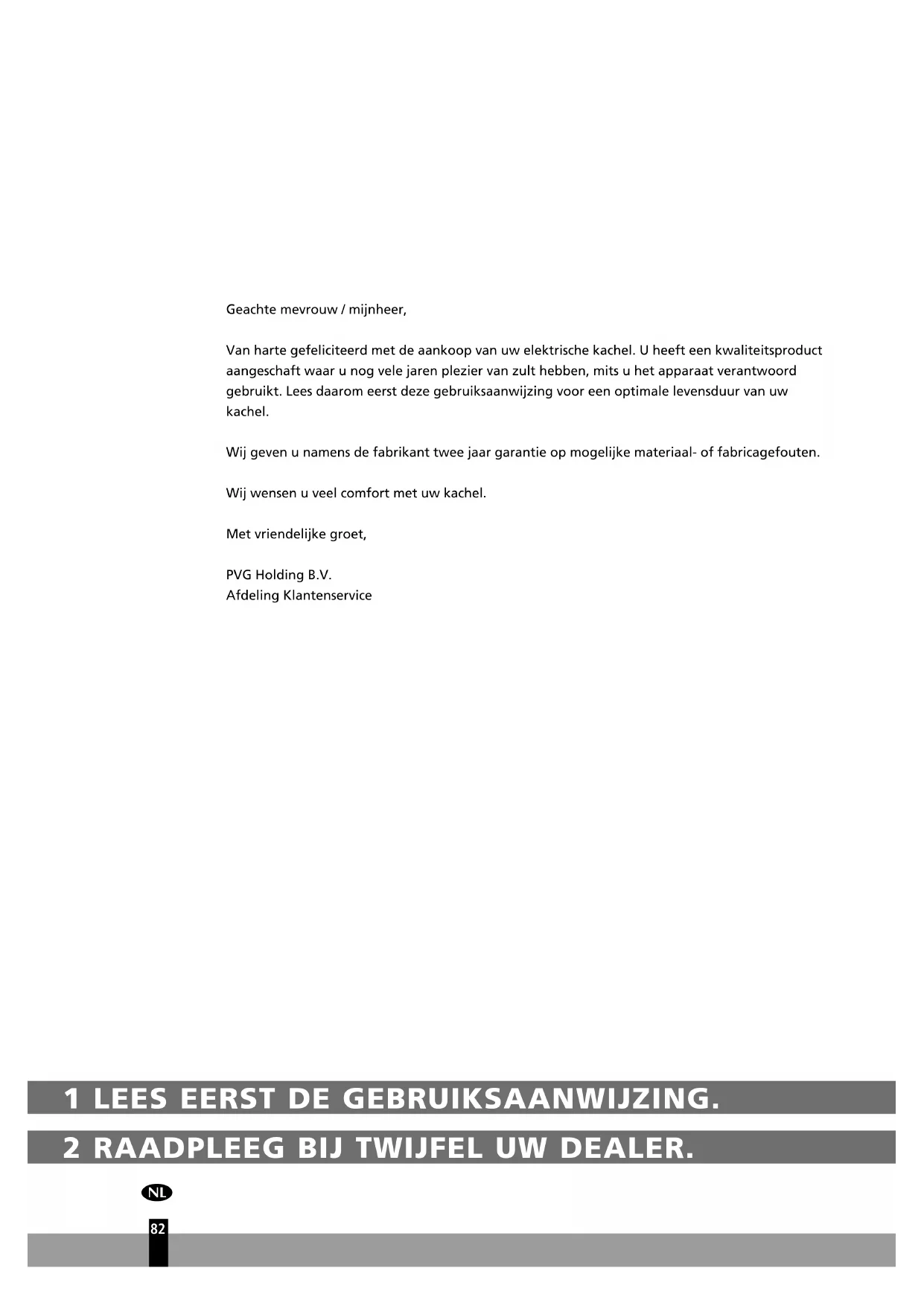 Geachte mevrouw / mijnheer, Van harte gefeliciteerd met de aankoop van uw elektrische kachel. U heeft een kwaliteitsproduct aangeschaft waar u nog vele jaren plezier van zult hebben, mits u het apparaat verantwoord gebruikt. Lees daarom eerst deze gebruiksaanwijzing voor een optimale levensduur van uw kachel. Wij geven u namens de fabrikant twee jaar garantie op mogelijke materiaal- of fabricagefouten. Wij wensen u veel comfort met uw kachel. Met vriendelijke groet, PVG Holding B.V. Afdeling KlantenserviceWICHTIGE BAUTEILE BedienfeldTrockenluftauslassAbnehmbarer WassertankFeuchtlufteinlassLuftfilterAbflussrohr (ø 13mm) mit Kappe LenkrolleNetzstecker und NetzkabelGriffABC4EFGHI 831 BITTE LESEN SIE ZUERST DIE GEBRAUCHSANLEITUNG.2 BEI FRAGEN, WENDEN SIE SICH AN IHREN HÄNDLER. KERN- COMPO- NENTEN Voorplaat Koude lucht inlaat Bedienings- paneel Warme lucht uitlaat Afstands- bediening