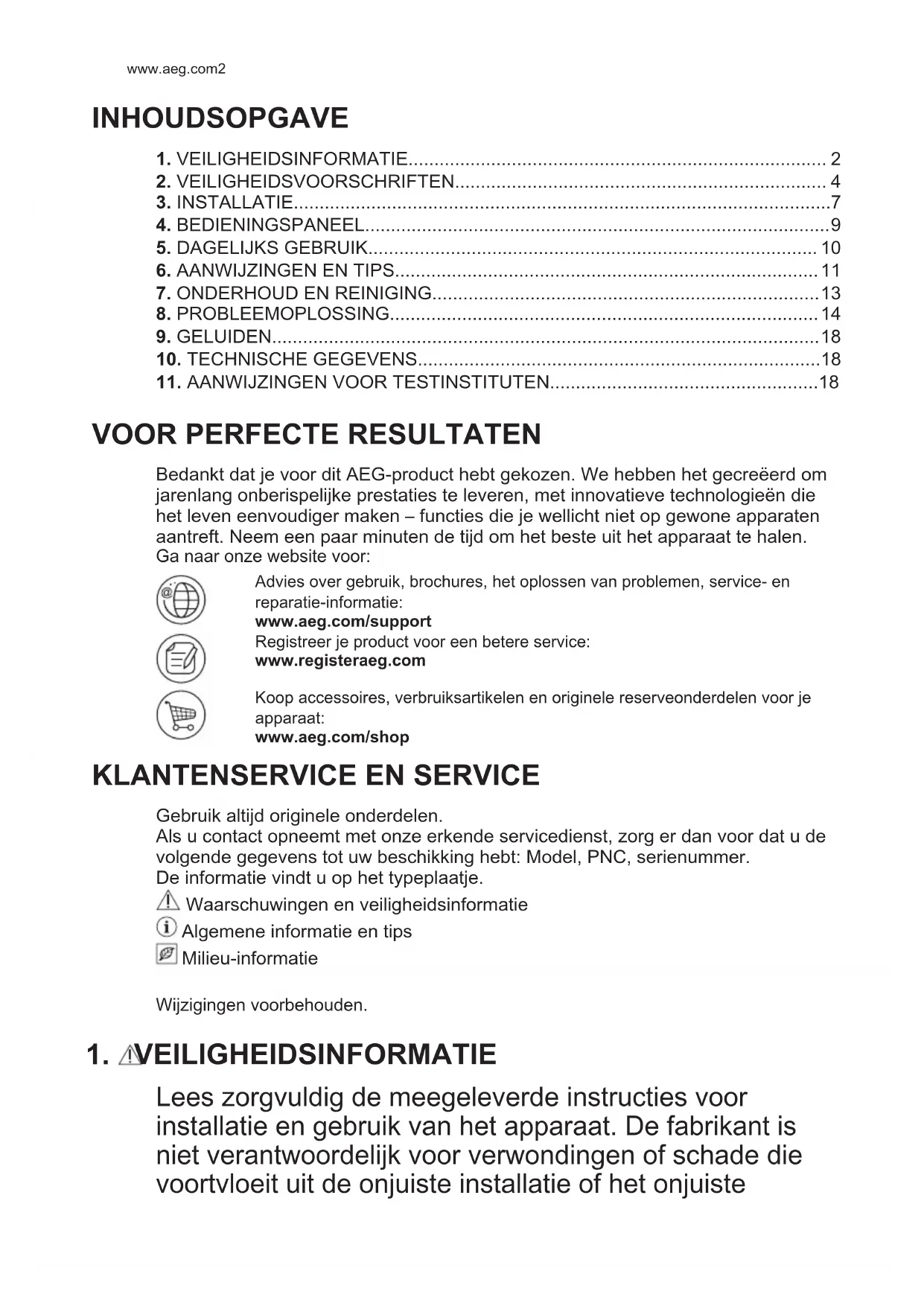 Bedankt dat je voor dit AEG-product hebt gekozen. We hebben het gecreëerd om jarenlang onberispelijke prestaties te leveren, met innovatieve technologieën die het leven eenvoudiger maken – functies die je wellicht niet op gewone apparaten aantreft. Neem een paar minuten de tijd om het beste uit het apparaat te halen. Ga naar onze website voor: Advies over gebruik, brochures, het oplossen van problemen, service- en reparatie-informatie: www.aeg.com/support Registreer je product voor een betere service: www.registeraeg.com Koop accessoires, verbruiksartikelen en originele reserveonderdelen voor je apparaat: www.aeg.com/shop