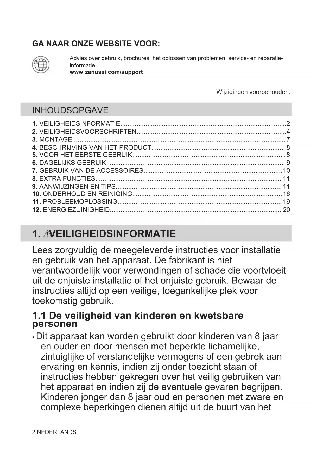 Recycleer de materialen met het symbool . Gooi de verpakking in een geschikte afvalcontainer om het te recycleren. Bescherm het milieu en de volksgezondheid en recycleer op een correcte manier het afval van elektrische en elektronische apparaten. Gooi apparaten gemarkeerd met het symbool niet weg met het huishoudelijk afval. Breng het product naar het milieustation bij u in de buurt of neem contact op met de gemeente. NEDERLANDS 21VISIT OUR WEBSITE TO: Get usage advice, brochures, trouble shooter, service and repair information:www.zanussi.com/supportSubject to change without notice. CONTENTS
