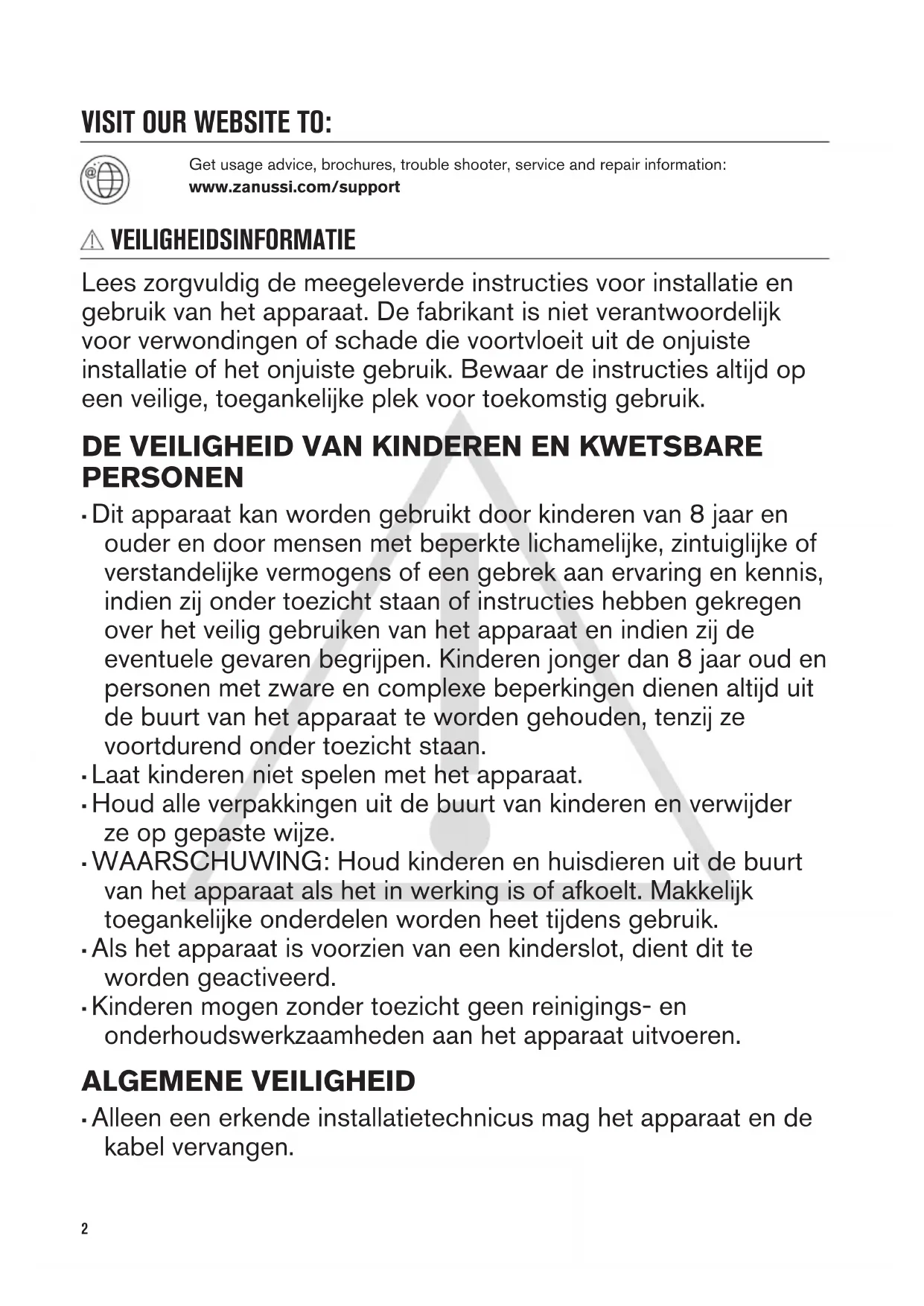 - Kinderen mogen zonder toezicht geen reinigings- en onderhoudswerkzaamheden aan het apparaat uitvoeren. ALGEMENE VEILIGHEID