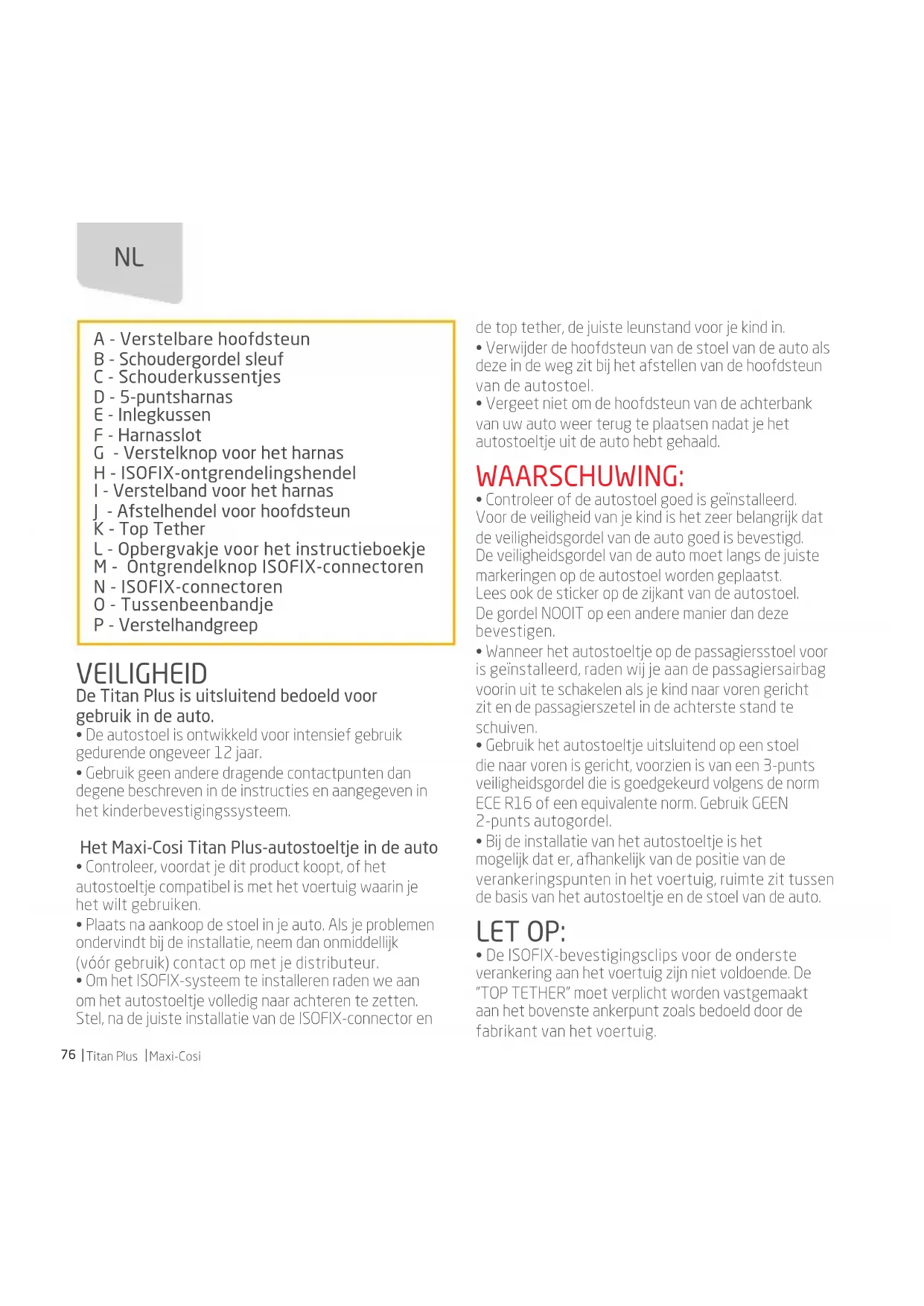 - De ISOFIX-bevestigingsclips voor de onderste verankering aan het voertuig zijn niet voldoende. De “TOP TETHER” moet verplicht worden vastgemaakt aan het bovenste ankerpunt zoals bedoeld door de fabrikant van het voertuig. A - Verstelbare hoofdsteun B - Schoudergordel sleuf C - Schouderkussentjes D - 5-puntsharnas E - Inlegkussen F - Harnasslot G - Verstelknop voor het harnas H - ISOFIX-ontgrendelingshendel I - Verstelband voor het harnas J - Afstelhendel voor hoofdsteun K - Top Tether L - Opbergvakje voor het instructieboekje M - Ontgrendelknop ISOFIX-connectoren N - ISOFIX-connectoren O - Tussenbeenbandje P - Verstelhandgreep NLMaxi-Cosi