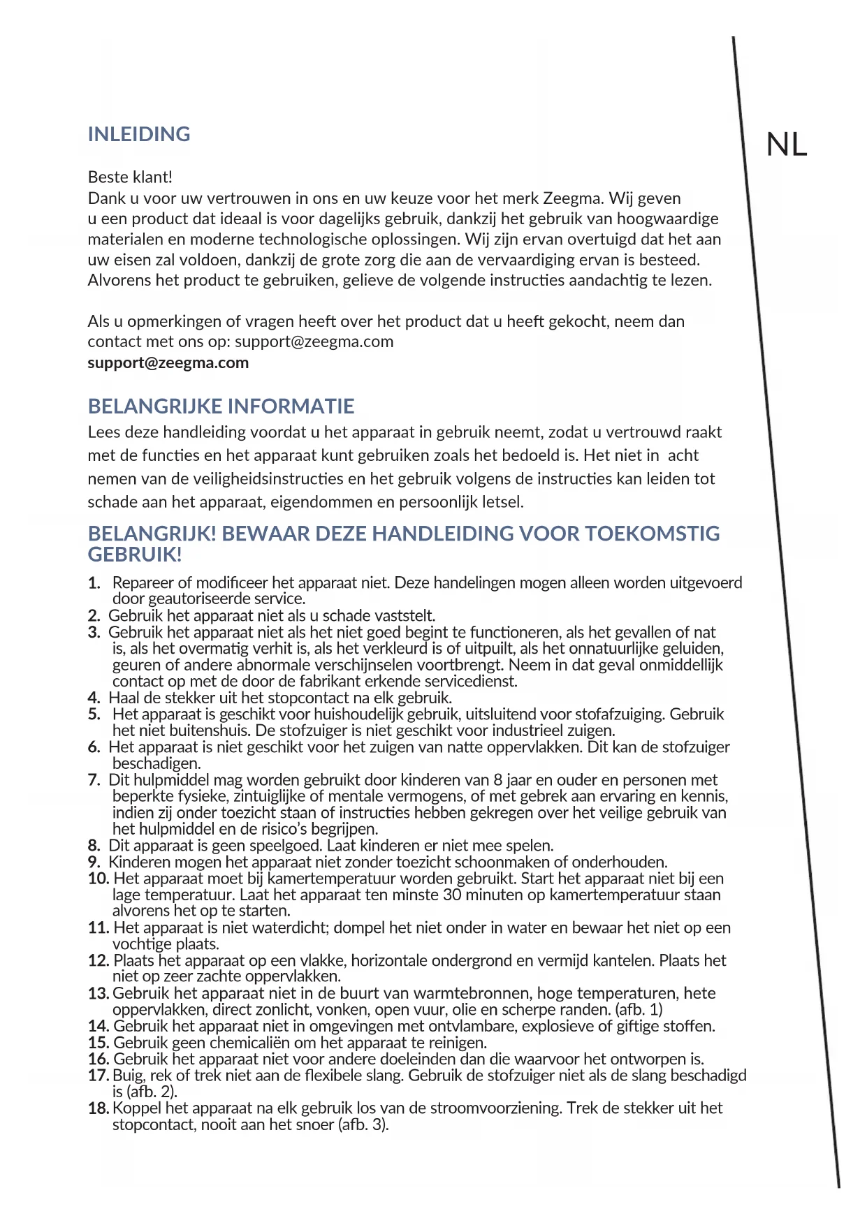 alfombras en el soporte del aspirador. Las fotos solo enen carácter ilustravo, el aspecto real de los productos puede diferir de los presentados en las fotos. Botón de rebobinado 1NL INLEIDING Beste klant! Dank u voor uw vertrouwen in ons en uw keuze voor het merk Zeegma. Wij geven u een product dat ideaal is voor dagelijks gebruik, dankzij het gebruik van hoogwaardige materialen en moderne technologische oplossingen. Wij zijn ervan overtuigd dat het aan uw eisen zal voldoen, dankzij de grote zorg die aan de vervaardiging ervan is besteed. Alvorens het product te gebruiken, gelieve de volgende instruces aandachg te lezen. Als u opmerkingen of vragen hee over het product dat u hee gekocht, neem dan contact met ons op: support@zeegma.com support@zeegma.com BELANGRIJKE INFORMATIE Lees deze handleiding voordat u het apparaat in gebruik neemt, zodat u vertrouwd raakt met de funces en het apparaat kunt gebruiken zoals het bedoeld is. Het niet in acht nemen van de veiligheidsinstruces en het gebruik volgens de instruces kan leiden tot schade aan het apparaat, eigendommen en persoonlijk letsel.