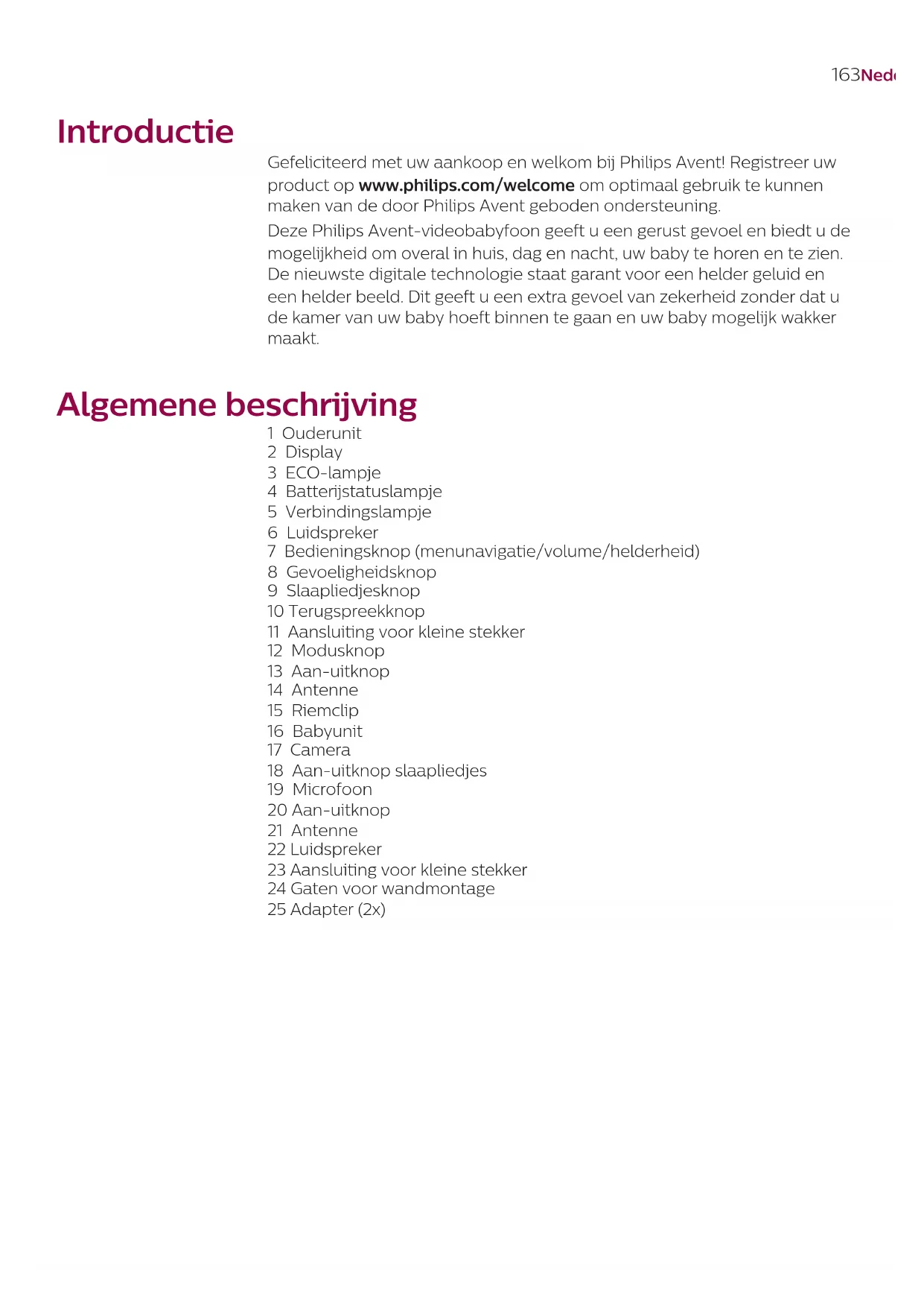 Domanda Risposta Perché il mio baby monitor funziona invece a distanze molto inferiori rispetto a quelle specicate nel presente manuale dell'utente? La portata di funzionamento specicata di 300 metri è valida solo in esterno, all'aria aperta e in linea d'aria. A seconda dell'ambiente circostante e di altri fattori di disturbo, la portata di funzionamento potrebbe essere inferiore (vedere anche la tabella nel capitolo relativo al posizionamento dell'unità genitore e dell'unità bembino). All'interno delle mura domestiche la portata operativa è no a 50 metri, ed è inoltre limitata dal numero e dal tipo di pareti e/o sotti interposti tra l'unità genitore e l'unità bambino. La durata di funzionamento dell'unità genitore dovrebbe essere no a 10 ore. Perché l'autonomia della mia unità genitore è inferiore? La luminosità del video dell'unità genitore potrebbe essere impostata troppo alta, comportandone un consumo maggiore di energia. Diminuite la luminosità dell'unità genitore. L'unità genitore consuma molta energia quando il display video è acceso continuamente. Attivate la modalità AUDIO, VOX, o ECO nel menu dell'unità genitore per aumentare i tempi di funzionamento (vedere il capitolo "Caratteristiche", sezione "modalità AUDIO", "modalità VOX" o "modalità ECO"). Il volume dell'unità genitore potrebbe essere impostato troppo alto comportandone un consumo maggiore di energia. Diminuite il volume dell'unità genitore. Come in ogni altro dispositivo elettronico ricaricabile, la capacità della batteria diminuisce dopo un lungo periodo di utilizzo. DISPLAY VIDEO Domanda Risposta Perché l'unità genitore è soggetta a interferenze? Perché il display video sull'unità genitore traballa? Può vericarsi un'interferenza quando l'unità genitore è fuori portata dell'unitàba. Può vericarsi inoltre un'interferenza se vi sono troppe pareti o sotti tra l'unità genitore e l'unità bambino o se sono accesi altri dispositivi wireless a 2,4 GHz (ad esempio forno a microonde, router Wi-Fi). È possibile che siano presenti più di 2 set di baby monitor e, di conseguenza, potrebbero vericarsi interferenze. Tenere le 2 unità di baby monitor a distanza, idealmente in stanze separate. Posizionare l'unità genitore in un luogo dierente, più vicino all'unità bambino o spegnere gli altri dispositivi wireless. Potrebbe essere necessario ricaricare la batteria ricaricabile dell'unità genitore.161Italiano DISPLAY VIDEO Perché non viene visualizzata alcuna immagine sul display video mentre il collegamento emette un colore verde? L'unità genitore potrebbe essere in modalità AUDIO, VOX o ECO. Per cambiare modalità (vedere 'Modalità')premere il pulsante relativo alle modalità sul lato destro dell'unità genitore. Perché l'immagine sul display video non è chiara? La luminosità del display potrebbe essere impostata troppo bassa. Aumentate la luminosità del display sull'unità genitore utilizzando il pulsante di controllo al centro. Forse la lente dell'unità bambino è sporca. Pulite la lente con un panno asciutto. L'unità bambino potrebbe essere troppo lontana dal bambino. Per il rilevamento ottimale del video, assicuratevi che l'unità bambino non si trovi a più di 1,5 metri di distanza dal bambino stesso. Una distanza inferiore ad 1 metro aumenta il rischio di strangolamento.162 Italiano Montaggio a parete Istruzioni di stampa: stampate questa pagina in scala 100 % utilizzate il modello per segnare accuratamente la posizione dei fori per le viti sul muro. Informazioni generali Batteria ricaricabile agli ioni di litio: (2600 mAh) Banda di frequenza FHSS: 2,4 GHz. Potenza massima a radiofrequenza: <= 20 dBm Unità di alimentazione Modello: ASSA105E-050100 (spina UE) oppure ASSA105B-050100 (spina Regno Unito) Ingresso: 100-240 V 50/60 Hz ~ 0,35 A Uscita: 5,0 V 1,0 A, 5,0 W Rendimento medio in modo attivo: >=73,62% Consumo energetico senza carico (W): 0,1 W163Nederlands Introductie Gefeliciteerd met uw aankoop en welkom bij Philips Avent! Registreer uw product op www.philips.com/welcome om optimaal gebruik te kunnen maken van de door Philips Avent geboden ondersteuning. Deze Philips Avent-videobabyfoon geeft u een gerust gevoel en biedt u de mogelijkheid om overal in huis, dag en nacht, uw baby te horen en te zien. De nieuwste digitale technologie staat garant voor een helder geluid en een helder beeld. Dit geeft u een extra gevoel van zekerheid zonder dat u de kamer van uw baby hoeft binnen te gaan en uw baby mogelijk wakker maakt. Algemene beschrijving 1 Ouderunit 2 Display 3 ECO-lampje 4 Batterijstatuslampje 5 Verbindingslampje 6 Luidspreker 7 Bedieningsknop (menunavigatie/volume/helderheid) 8 Gevoeligheidsknop 9 Slaapliedjesknop 10 Terugspreekknop 11 Aansluiting voor kleine stekker 12 Modusknop 13 Aan-uitknop 14 Antenne 15 Riemclip 16 Babyunit 17 Camera 18 Aan-uitknop slaapliedjes 19 Microfoon 20 Aan-uitknop 21 Antenne 22 Luidspreker 23 Aansluiting voor kleine stekker 24 Gaten voor wandmontage 25 Adapter (2x)164 Nederlands Belangrijke veiligheidsinformatie Lees deze belangrijke informatie zorgvuldig door voordat u het apparaat gaat gebruiken en bewaar de informatie om de aanwijzingen later opnieuw te kunnen raadplegen. BELANGRIJK Deze babyfoon is bedoeld als hulpmiddel. De babyfoon is geen vervanging voor verantwoordelijk en adequaat toezicht door volwassenen en moet ook niet als zodanig worden gebruikt.Laat uw baby nooit alleen thuis. Zorg dat er altijd iemand aanwezig is om op de baby te letten en voor de baby te zorgen. Vrijwaringsclausule U gebruikt deze babyfoon op eigen risico. Koninklijke Philips N.V. en haar dochterondernemingen zijn niet verantwoordelijk voor de bediening of uw gebruik van deze babyfoon. Daarom aanvaarden zij geen aansprakelijkheid in verband met uw gebruik van deze babyfoon. Gevaar - Dompel geen enkel deel van de babyfoon in water of een andere vloeistof. Plaats het apparaat niet op plaatsen waar water of andere vloeistoen op het apparaat kunnen lekken o