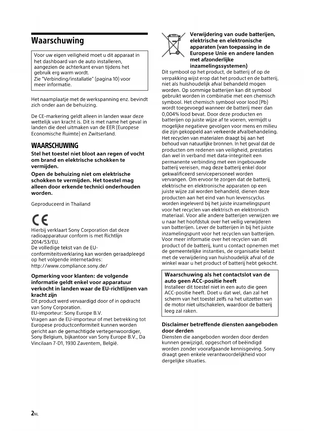 Soporte Soporte Fusible (10 A)2NL Waarschuwing Het naamplaatje met de werkspanning enz. bevindt zich onder aan de behuizing. De CE-markering geldt alleen in landen waar deze wettelijk van kracht is. Dit is met name het geval in landen die deel uitmaken van de EER (Europese Economische Ruimte) en Zwitserland. WAARSCHUWING Stel het toestel niet bloot aan regen of vocht om brand en elektrische schokken te vermijden. Open de behuizing niet om elektrische schokken te vermijden. Het toestel mag alleen door erkende technici onderhouden worden. Geproduceerd in Thailand Hierbij verklaart Sony Corporation dat deze radioapparatuur conform is met Richtlijn 2014/53/EU. De volledige tekst van de EU- conformiteitsverklaring kan worden geraadpleegd op het volgende internetadres: http://www.compliance.sony.de/ Opmerking voor klanten: de volgende informatie geldt enkel voor apparatuur verkocht in landen waar de EU-richtlijnen van kracht zijn Dit product werd vervaardigd door of in opdracht van Sony Corporation. EU-importeur: Sony Europe B.V. Vragen aan de EU-importeur of met betrekking tot Europese productconformiteit kunnen worden gericht aan de gemachtigde vertegenwoordiger, Sony Belgium, bijkantoor van Sony Europe B.V., Da Vincilaan 7-D1, 1930 Zaventem, België. Verwijdering van oude batterijen, elektrische en elektronische apparaten (van toepassing in de Europese Unie en andere landen met afzonderlijke inzamelingssystemen) Dit symbool op het product, de batterij of op de verpakking wijst erop dat het product en de batterij, niet als huishoudelijk afval behandeld mogen worden. Op sommige batterijen kan dit symbool gebruikt worden in combinatie met een chemisch symbool. Het chemisch symbool voor lood (Pb) wordt toegevoegd wanneer de batterij meer dan 0,004% lood bevat. Door deze producten en batterijen op juiste wijze af te voeren, vermijdt u mogelijke negatieve gevolgen voor mens en milieu die zijn gekoppeld aan verkeerde afvalbehandeling. Het recyclen van materialen draagt bij aan het behoud van natuurlijke bronnen. In het geval dat de producten om redenen van veiligheid, prestaties dan wel in verband met data-integriteit een permanente verbinding met een ingebouwde batterij vereisen, mag deze batterij enkel door gekwalificeerd servicepersoneel worden vervangen. Om ervoor te zorgen dat de batterij, elektrische en elektronische apparaten op een juiste wijze zal worden behandeld, dienen deze producten aan het eind van hun levenscyclus worden ingeleverd bij het juiste inzamelingspunt voor het recyclen van elektrisch en elektronisch materiaal. Voor alle andere batterijen verwijzen we u naar het hoofdstuk over het veilig verwijderen van batterijen. Lever de batterijen in bij het juiste inzamelingspunt voor het recyclen van batterijen. Voor meer informatie over het recyclen van dit product of de batterij, kunt u contact opnemen met de gemeentelijke instanties, de organisatie belast met de verwijdering van huishoudelijk afval of de winkel waar u het product of batterij hebt gekocht. Disclaimer betreffende diensten aangeboden door derden Diensten die aangeboden worden door derden kunnen gewijzigd, opgeschort of beëindigd worden zonder voorafgaande kennisgeving. Sony draagt geen enkele verantwoordelijkheid voor dergelijke situaties. Voor uw eigen veiligheid moet u dit apparaat in het dashboard van de auto installeren, aangezien de achterkant ervan tijdens het gebruik erg warm wordt. Zie "Verbinding/installatie" (pagina 10) voor meer informatie. Waarschuwing als het contactslot van de auto geen ACC-positie heeft Installeer dit toestel niet in een auto die geen ACC-positie heeft. Doet u dat wel, dan zal het scherm van het toestel zelfs na het uitzetten van de motor niet uitschakelen, waardoor de batterij leeg zal raken.3NL Opgelet
