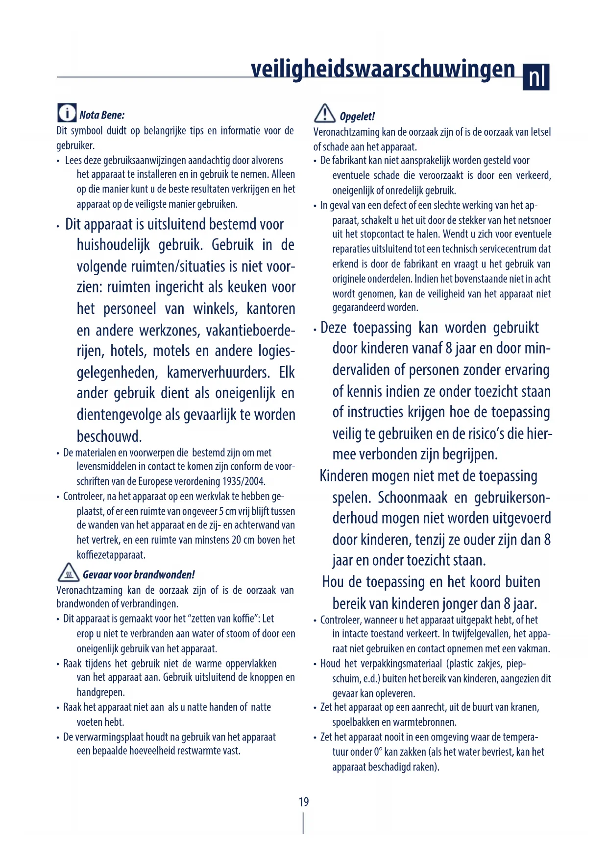 - Dit apparaat is uitsluitend bestemd voor huishoudelijk gebruik. Gebruik in de volgende ruimten/situaties is niet voor- zien: ruimten ingericht als keuken voor het personeel van winkels, kantoren en andere werkzones, vakantieboerde- rijen, hotels, motels en andere logies- gelegenheden, kamerverhuurders. Elk ander gebruik dient als oneigenlijk en dientengevolge als gevaarlijk te worden beschouwd.