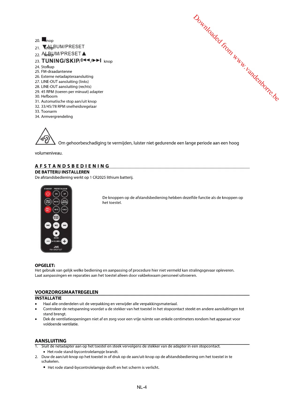 Downloaded from www.vandenborre.be NL-1WAARSCHUWING: Dit apparaat is alleen bestemd voor huishoudelijk gebruik en mag niet voor andere doeleinden of toepassingen worden gebruikt, zoals niet-huishoudelijk gebruik of in een commerciële omgeving. Ventilatie Laat minstens een vrije ruimte van 10cm rond het product. Belemmer de ventilatie niet door het afdekken van de ventilatiegaten met voorwerpen zoals een krant, tafelkleed, gordijn, etc. Plaats geen bronnen van open vuur, zoals kaarsen, op het apparaat. Houd rekening met het milieu bij het weggooien van batterijen. Gooi gebruikte batterijen niet weg met het huisvuil. Neem contact op met uw handelaar om het milieu te beschermen. Dit apparaat is niet geschikt voor gebruik in een tropisch klimaat. Stel het apparaat niet bloot aan druppelend of opspattend water en plaats geen, met vloeistof gevulde, voorwerpen zoals vazen op het apparaat. Om het milieu te beschermen, maak gebruik van de lokale recyclingvoorzieningen voor het afvoeren van gebruikte batterijen. Stel batterijen (geïnstalleerde accu of batterijen) nooit bloot aan overmatige warmte zoals zonlicht, vuur, etc. Wanneer de stekker of connector als stroomonderbreker wordt gebruikt, moet deze stroomonderbreker gemakkelijk te bedienen zijn. OPGELET Er is explosiegevaar als de batterij op een verkeerde manier wordt geplaatst. De batterij moet steeds vervangen worden door een batterij van hetzelfde of een gelijkwaardig type.