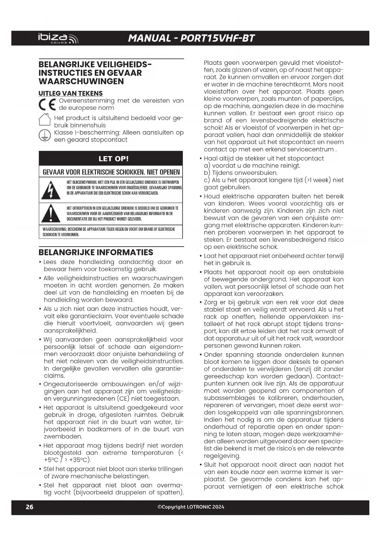 ©Copyright LOTRONIC 2024 VOX-FUNCTIE (OVERSPRAAK) Wanneer de VOX-functie is geactiveerd, neemt het muziekniveau af wanneer iemand in een van de microfoons spreekt. Het muziekniveau keert terug naar normaal wanneer de gebruiker stopt met in de microfoon te spreken. Om deze functie te activeren, zet u de VCV-scha- kelaar (16) aan. Om deze functie uit te schakelen, zet u de schakelaar op uit . OPNAMEFUNCTIE (REC) Houd er rekening mee dat ALLEEN GELUID VAN DE MICROFOON(‘s) (draadloze microfoons, aangesloten bedrade microfoons en/of gitaar) kan worden opgenomen. U kunt alleen opne- men op een USB- of SD-apparaat. Om de opname te starten, drukt u op de RE- CORD-knop (9) op de luidspreker of op de RE- CORD-knop op de afstandsbediening. De PLAY-indicator gaat uit en de REC-indicator wordt oranje. Er wordt een bestand aangemaakt op uw USB-sleutel of SD-kaart (in een specieke map in de hoofdmap van het USB/SD-apparaat). Om de opname te stoppen, drukt u nogmaals op de RECORD-knop. De REC-indicator gaat uit en de PLAY-indicator wordt blauw. Om naar uw opname te luisteren, selecteert u het nummer op de SD-kaart of USB-stick. Houd er rekening mee dat u niet hetzelfde USB/ SD-apparaat kunt gebruiken om tegelijkertijd af te spelen en op te nemen. VOLUMEREGELAARS Elke ingangssectie (multimediaspeler, bedrade microfoons, draadloze microfoons) heeft zijn eigen volumeregelaars, die aan de achterkant van de luidsprekers moeten worden aangepast, behalve de multimediaspeler, die kan worden aangepast met de afstandsbediening. Als deze regelaars op minimum staan, is er geen geluid, ook al staat het hoofdvolume op maximum. Stel het mastervolume in op een geschikt niveau en pas het volume van de individuele ingangen aan met behulp van hun respectievelijke volu- meregelaars. REINIGING Haal de stekker van de machine uit het stopcontact voordat u gaat schoonmaken. Ge- bruik geen agressieve schoonmaakmiddelen. Gebruik een schone doek om stof en vuil van het product te verwijderen. Wij zijn niet aansprakelijk voor schade veroorzaakt door onjuiste behan- deling, onoordeelkundig gebruik of slijtage. Wij behouden ons het recht voor om zonder voo- rafgaande kennisgeving technische wijzigingen aan te brengen. SPECIFICATIES Woofer ......................................................................................15"/38cm Tweeter ...................................1"/25 mm compressiedriver Gevoeligheid ............................................................101 dB ± 2 dB Max. SPL ................................................................................................115dB Impedantie ................................................................................4 Ohm Freq. bereik ............................................................... 40-20.000 Hz Ingebouwde batterij ................12V/4,5Ah LOOD-ZUUR Reservebatterij ref. .............BAT-POORT7.2A - 15-6012 USB-formaat ............................................................................... FAT32 Ondersteunde formaten ............... .mp3, . wma , .wav Bluetooth-frequentie ...............................2402-2480 MHz BT-max. RF-vermogen ..........................................-2,32 dBm VHF handmicrofoonfreq. .....................................207,5 MHz VHF-handmicrofoon .............PORTHAND12-15-6005D VHF-headsetmicrofoonfreq. ............................203,5 MHz VHF-hoofdmicrofoon ............PORTHEAD12-15-6005C VHF MIC-batterij / microfoon .............. 2 x AA-batterij Max. RF-vermogen handmicrofoon ...........0,79 dBm Max. RF-headsetmicrofoon ............................... 2,66 dBm Batterij voor afstandsbediening ........................CR2025 Voeding ..................................................220-240V~ / 50-60Hz DC-voeding ....................................................................................12V𝌃 Productafmetingen ................................415x350x680mm Nettogewicht ..............................................................................16.5kg Afmetingen verpakking .................... 495x470x765mm Brutogewicht ............................................................................ 19,5 kgCode: 15-6022