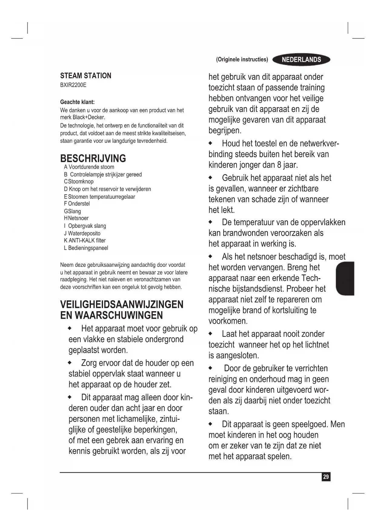 STEAM STATION BXIR2200E Geachte klant: We danken u voor de aankoop van een product van het merk Black+Decker. De technologie, het ontwerp en de functionaliteit van dit product, dat voldoet aan de meest strikte kwaliteitseisen, staan garantie voor uw langdurige tevredenheid. BESCHRIJVING A Voortdurende stoom B Controlelampje strijkijzer gereed C Stoomknop D Knop om het reservoir te verwijderen E Stoomen temperatuurregelaar F Onderstel G Slang H Netsnoer I Opbergvak slang J Waterdeposito KANTI-KALKlter L Bedieningspaneel Neem deze gebruiksaanwijzing aandachtig door voordat u het apparaat in gebruik neemt en bewaar ze voor latere raadpleging. Het niet naleven en veronachtzamen van deze voorschriften kan een ongeluk tot gevolg hebben. VEILIGHEIDSAANWIJZINGEN EN WAARSCHUWINGEN Het apparaat moet voor gebruik op een vlakke en stabiele ondergrond geplaatst worden. Zorg ervoor dat de houder op een stabiel oppervlak staat wanneer u het apparaat op de houder zet. Dit apparaat mag alleen door kin- deren ouder dan acht jaar en door personen met lichamelijke, zintui- glijke of geestelijke beperkingen, of met een gebrek aan ervaring en kennis gebruikt worden, als zij voor het gebruik van dit apparaat onder toezicht staan of passende training hebben ontvangen voor het veilige gebruik van dit apparaat en zij de mogelijke gevaren van dit apparaat begrijpen. Houd het toestel en de netwerkver- binding steeds buiten het bereik van kinderen jonger dan 8 jaar. Gebruik het apparaat niet als het is gevallen, wanneer er zichtbare tekenen van schade zijn of wanneer het lekt. De temperatuur van de oppervlakken kan brandwonden veroorzaken als het apparaat in werking is. Als het netsnoer beschadigd is, moet het worden vervangen. Breng het apparaat naar een erkende Tech- nische bijstandsdienst. Probeer het apparaat niet zelf te repareren om mogelijke brand of kortsluiting te voorkomen. Laat het apparaat nooit zonder toezicht wanneer het op het lichtnet is aangesloten. Door de gebruiker te verrichten reiniging en onderhoud mag in geen geval door kinderen uitgevoerd wor- den als zij daarbij niet onder toezicht staan. Dit apparaat is geen speelgoed. Men moet kinderen in het oog houden om er zeker van te zijn dat ze niet met het apparaat spelen.NEDERLANDS (Originele instructies)