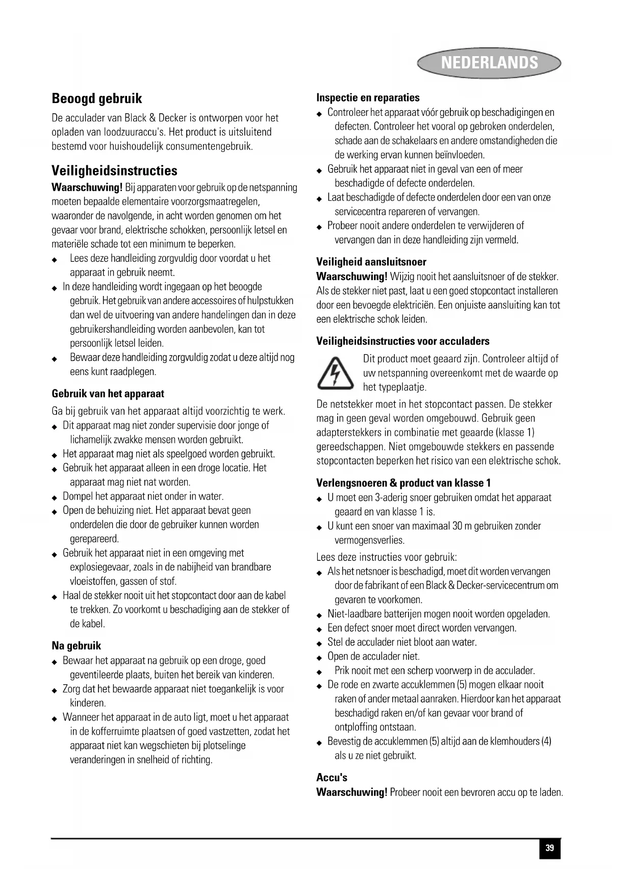 Download de handleiding voor uw Batterijlader in PDF-formaat gratis! Vind uw handleiding BDV1085 - BLACK & DECKER en neem uw elektronisch apparaat weer in handen. Op deze pagina staan alle documenten die nodig zijn voor het gebruik van uw apparaat. BDV1085 van het merk BLACK & DECKER.