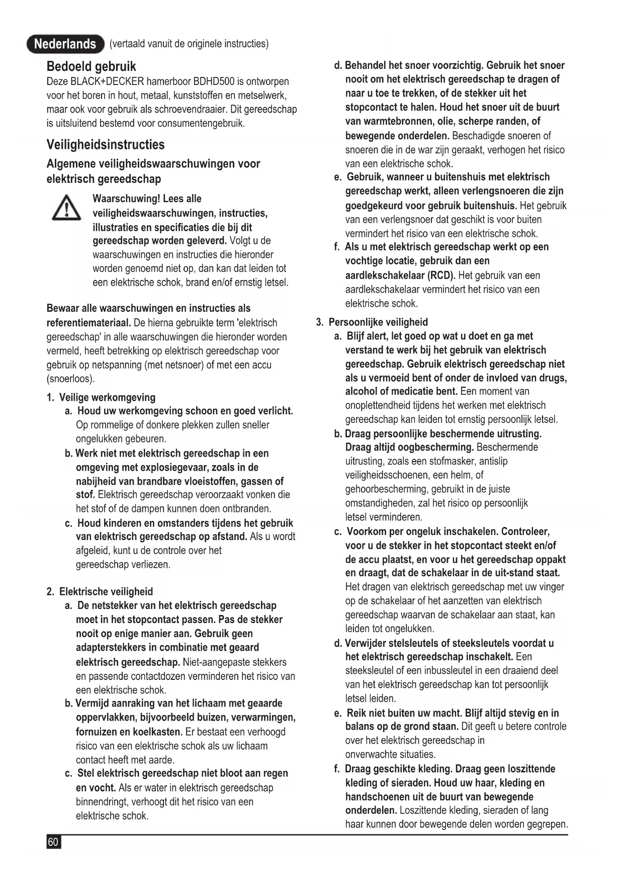 (vertaald vanuit de originele instructies) Nederlands (vertaald vanuit de originele instructies) Bedoeld gebruik Deze BLACK+DECKER hamerboor BDHD500 is ontworpen voor het boren in hout, metaal, kunststoffen en metselwerk, maar ook voor gebruik als schroevendraaier. Dit gereedschap is uitsluitend bestemd voor consumentengebruik. Veiligheidsinstructies Algemene veiligheidswaarschuwingen voor elektrisch gereedschap Waarschuwing! Lees alle veiligheidswaarschuwingen, instructies, illustraties en specicaties die bij dit gereedschap worden geleverd. Volgt u de waarschuwingen en instructies die hieronder worden genoemd niet op, dan kan dat leiden tot een elektrische schok, brand en/of ernstig letsel. Bewaar alle waarschuwingen en instructies als referentiemateriaal. De hierna gebruikte term 'elektrisch gereedschap' in alle waarschuwingen die hieronder worden vermeld, heeft betrekking op elektrisch gereedschap voor gebruik op netspanning (met netsnoer) of met een accu (snoerloos).
